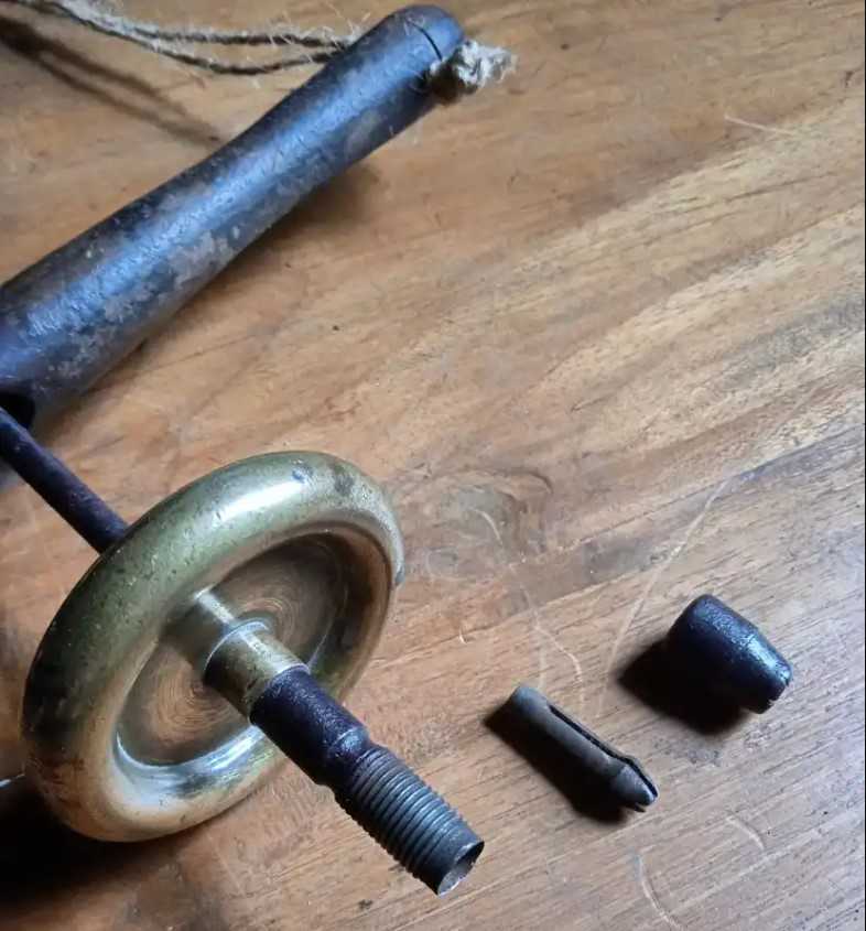 Roda kuningan sebagai pemberat yang seimbang sempurna membuat Bor Archimedes berputar ke arah bergantian saat gagang kayu dinaikkan dan diturunkan dengan mulus.