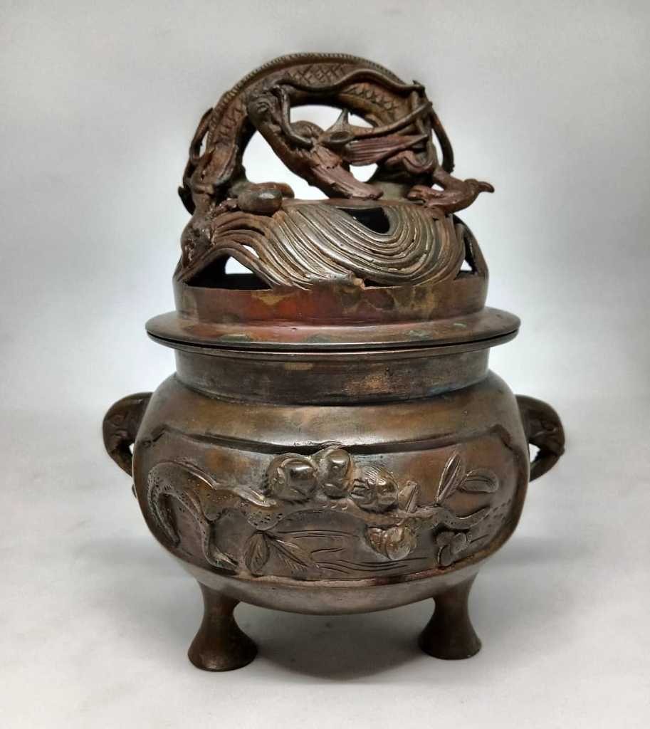 PEMBAKAR/PENDUPA PERUNGGU CINA, c. abad ke-19. BAGIAN YANG INDAH INI DIHIASI DENGAN NAGA TIGA DIMENSI BESAR DENGAN RINCIAN HALUS PADA TUTUPNYA. DASAR TRIPOD YANG TIDAK BIASA MEMILIKI DUA PANEL SAMPING BERukir, SATUNYA DIHIASI DENGAN ANAK BURUNG RELIEF TINGGI DAN SISI LAINNYA MEMILIKI 2BURUNG DEWASA SEDANG BERCENGKRAMA . PEGANGAN GAJAH. PATINA BERUMUR ALAMI YANG INDAH DI SELURUH. UKURAN TINGGI 15 CM. HARGA 14 JT