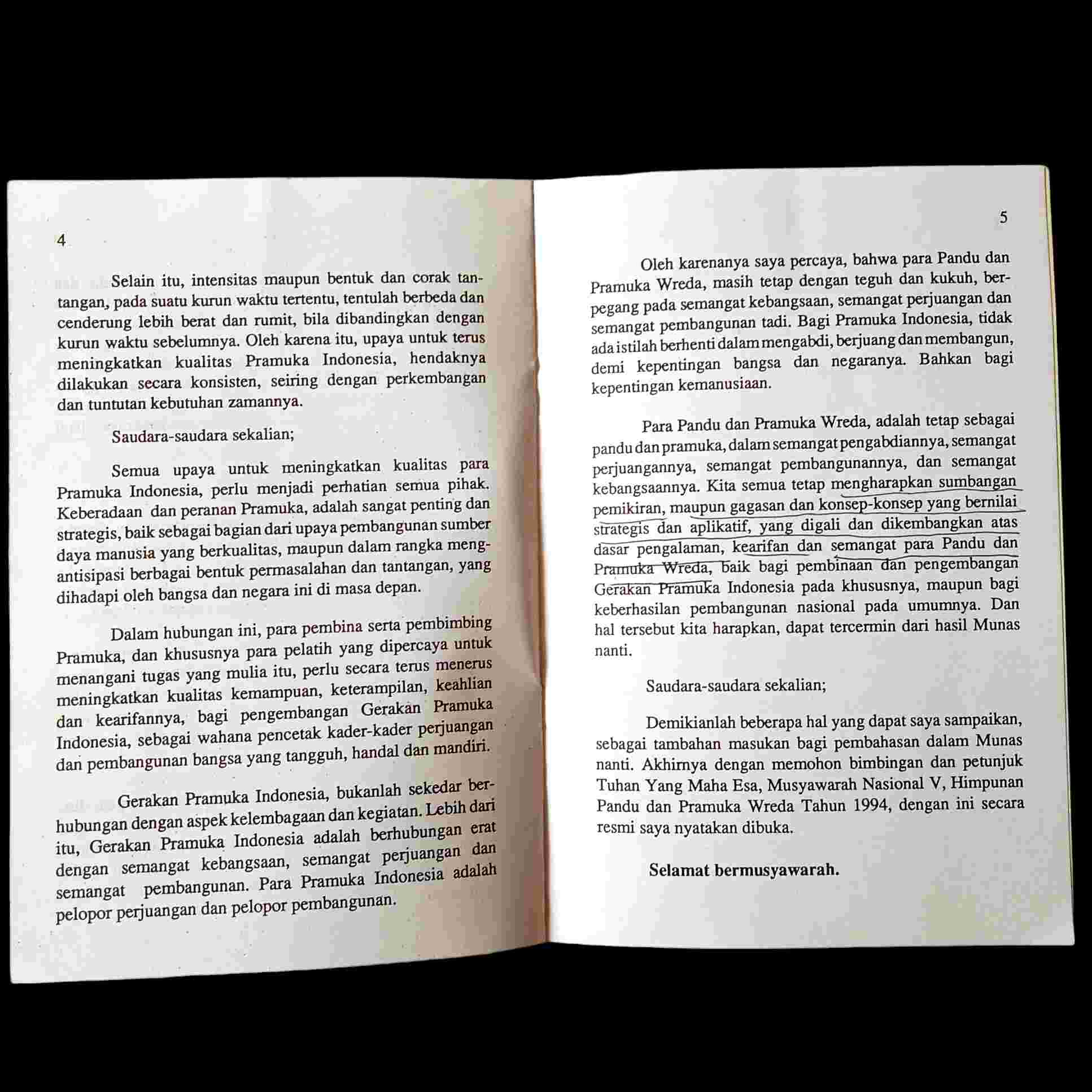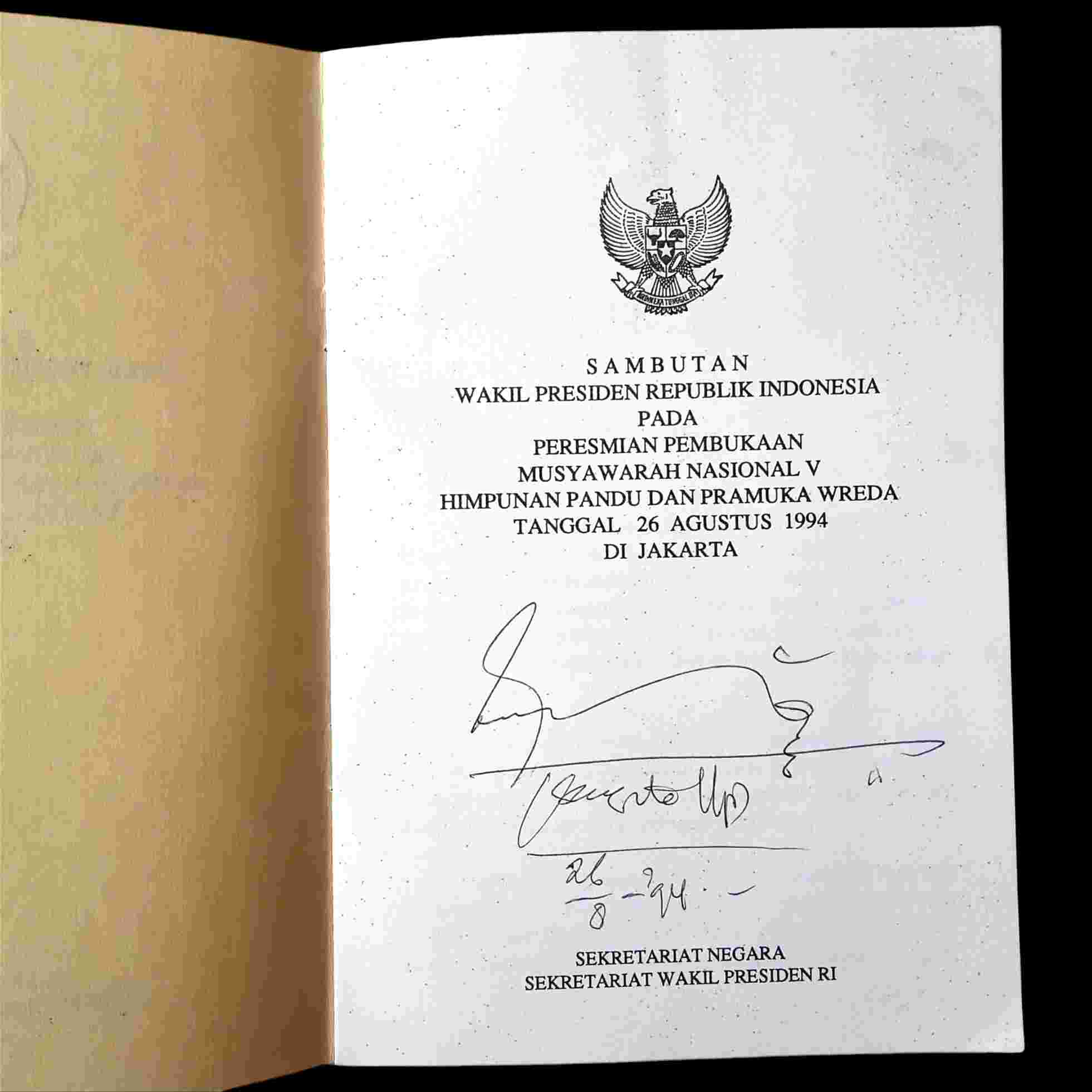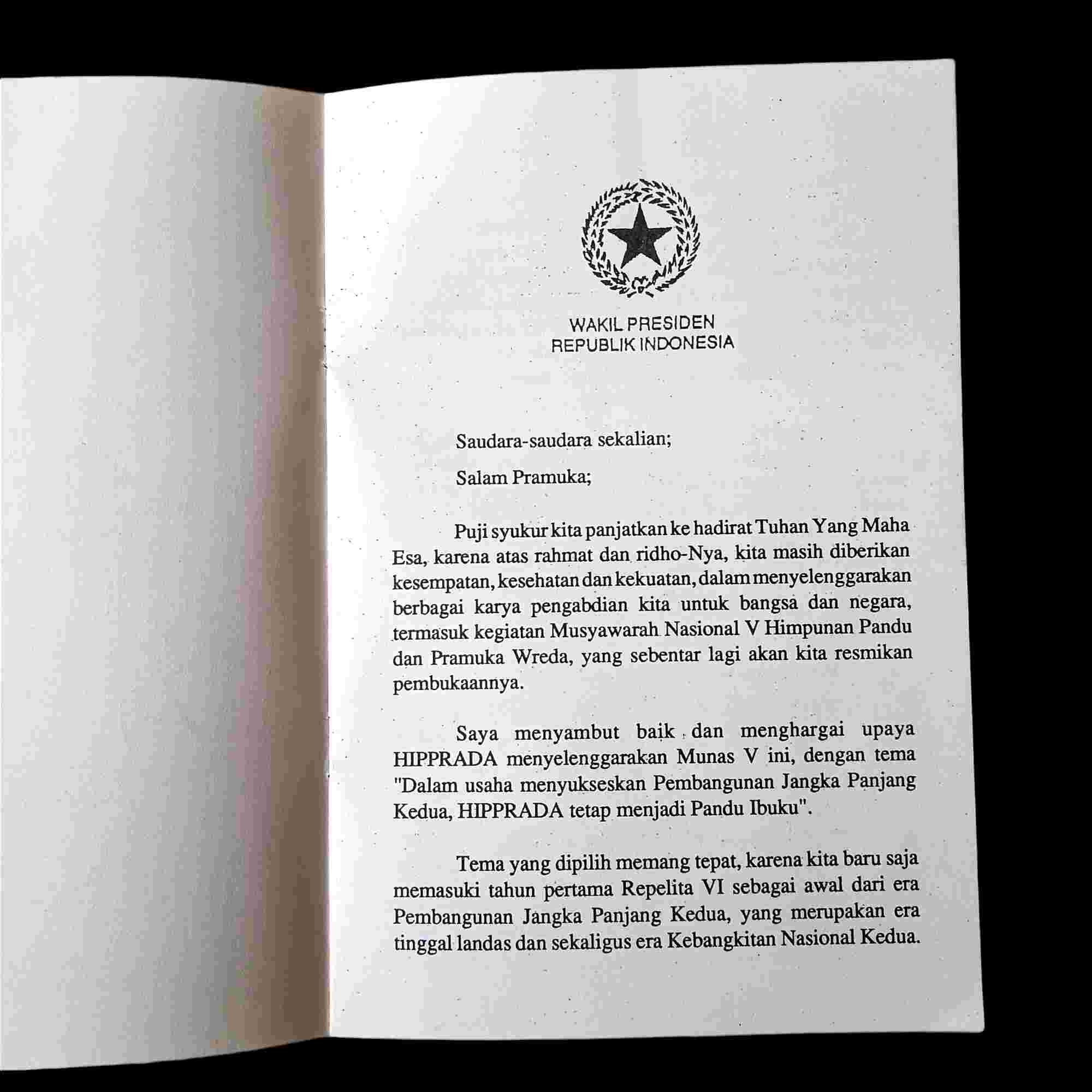 Buku Lama Tentang Pramuka Sambutan Wakil Presiden RI Bp.Tri Sutrisno Pada Pembukaa Musyawarah Nasional V Himpunan Pandu dan Pramuka Wreda Tanggal 26 Agustus1994 Jakarta Isi 6 Halaman Sekretariat Negara Wakil Presiden RI