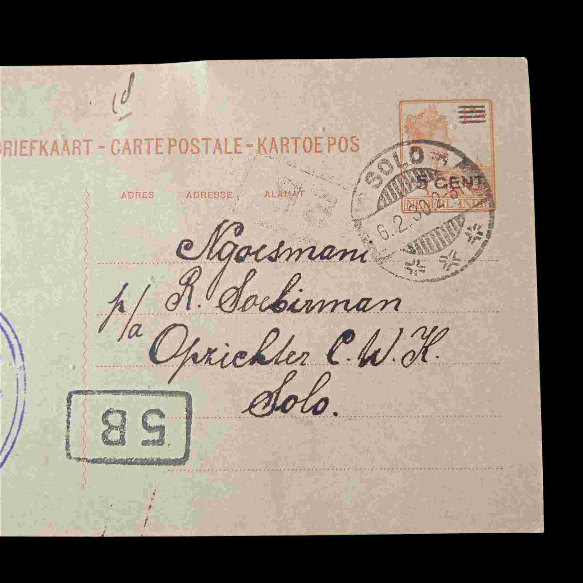 Antik Kartu Pos Era Kolonial Terkirim Soerakarta-Toeban Feb.1930 Tua