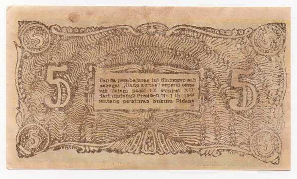 BL 1625 Indonesia 5 Rupiah Bukittinggi Tahun 1948 AU Flek Sudut2 Ada Misshandling