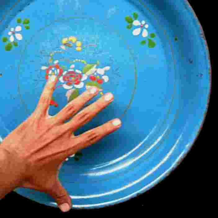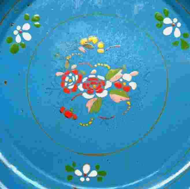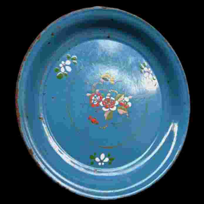 Nampan Enamel Biru Antik Lukis Timbul Diameter : 40cm Kondisi Utuh Minat Silahkan