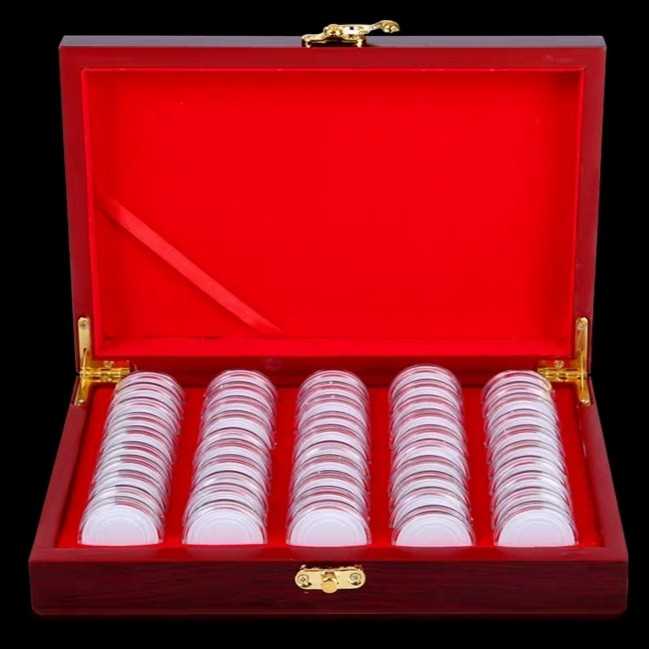 Box kayu merah 50 Kapsul koin bulat 30 mm busa 255 x 165 x 50 mmUkuran : 255 x 165 x 50 mmIsi : 50 pcs kapsul koin 30 mm busaBerat : 750 gram