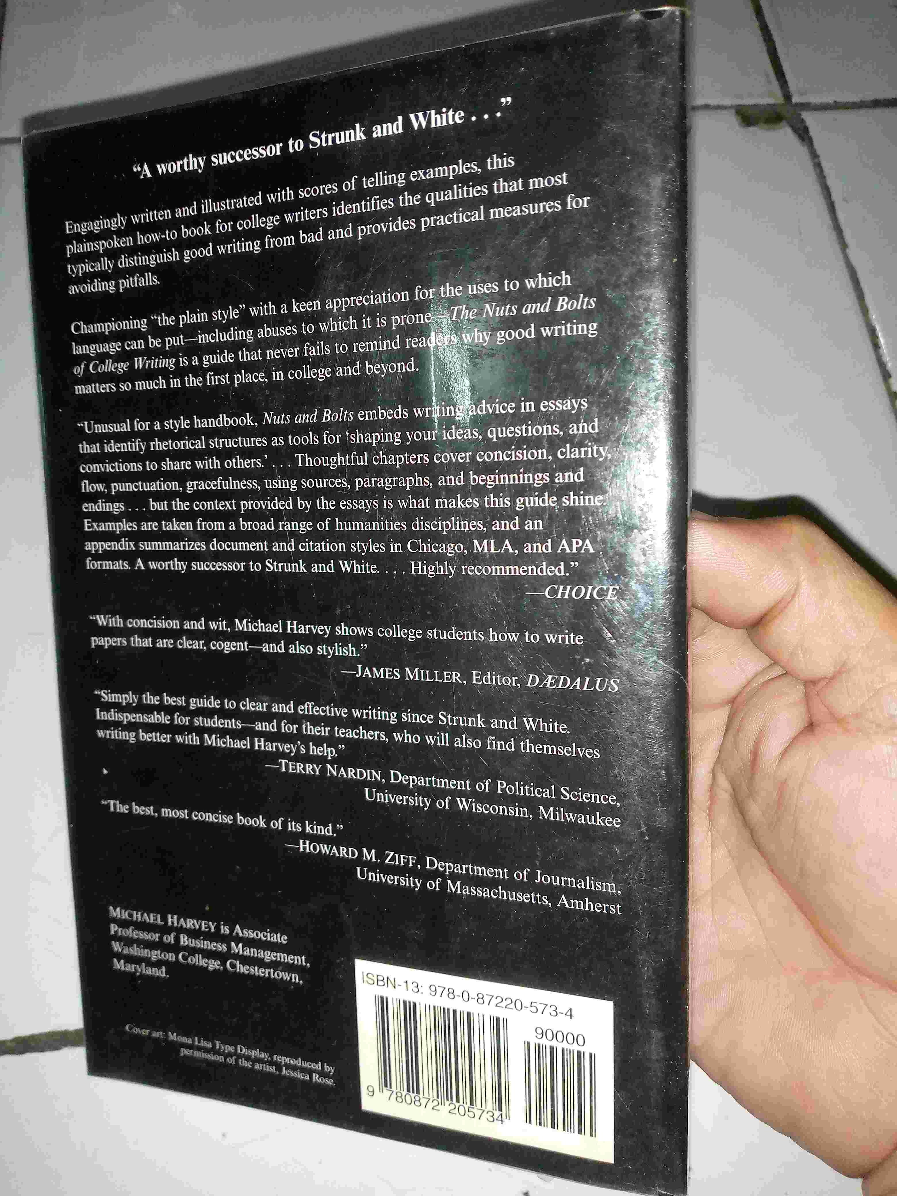 Buku THE NUTS AND BOLTS OF COLLEGE WRITING By Michael Harvey Printed in U S A Tahun 2003 Plastic & Soft Cover Tebal 102 halaman Seukuran Buku Berat 150 gram Harga 16,5 ribu Moga Bermanfaat Yah...