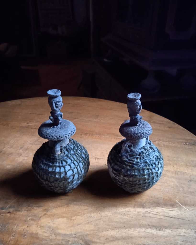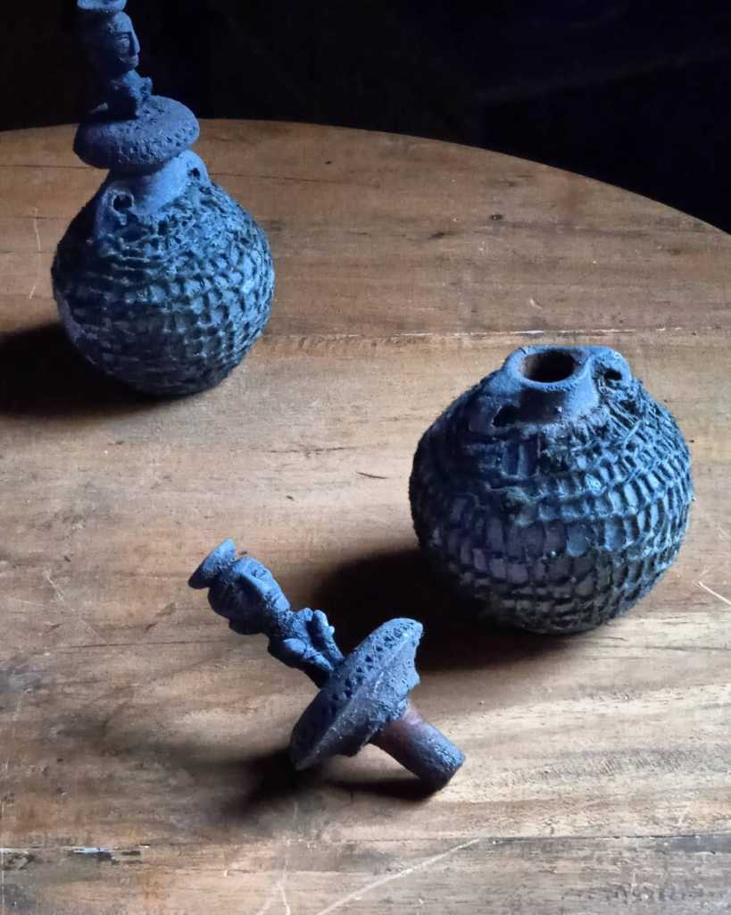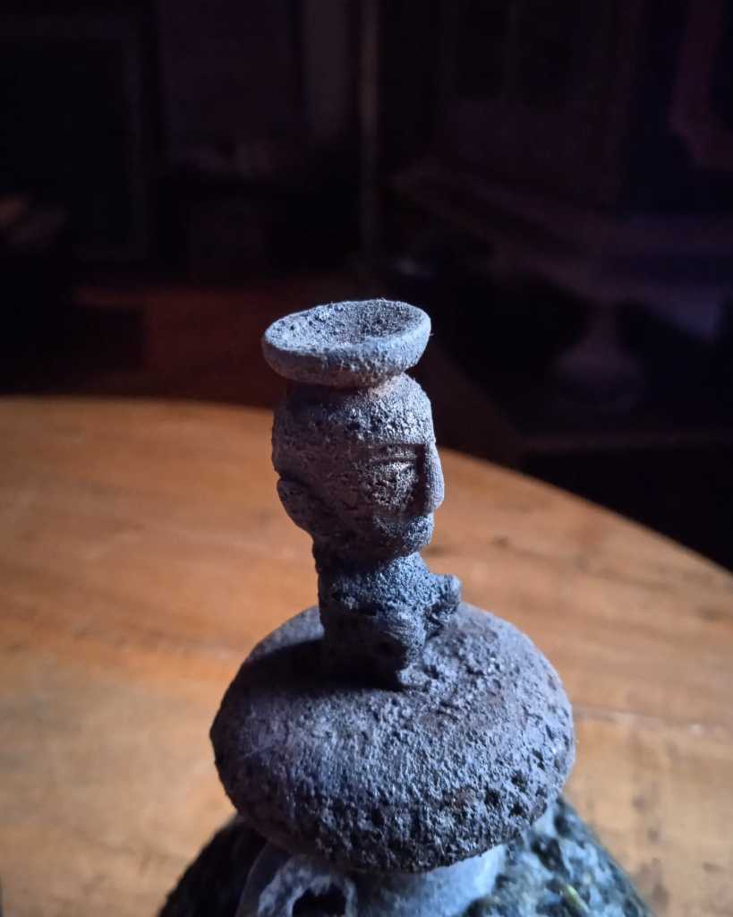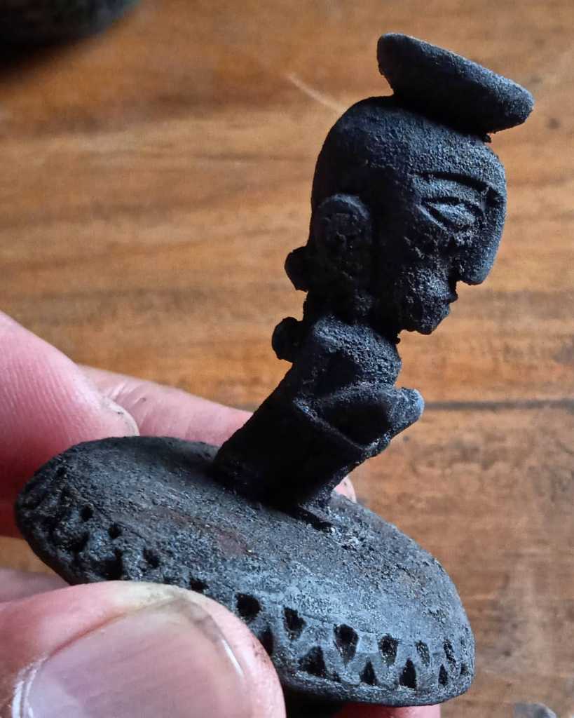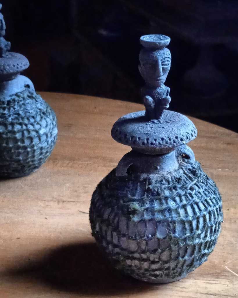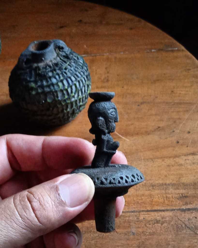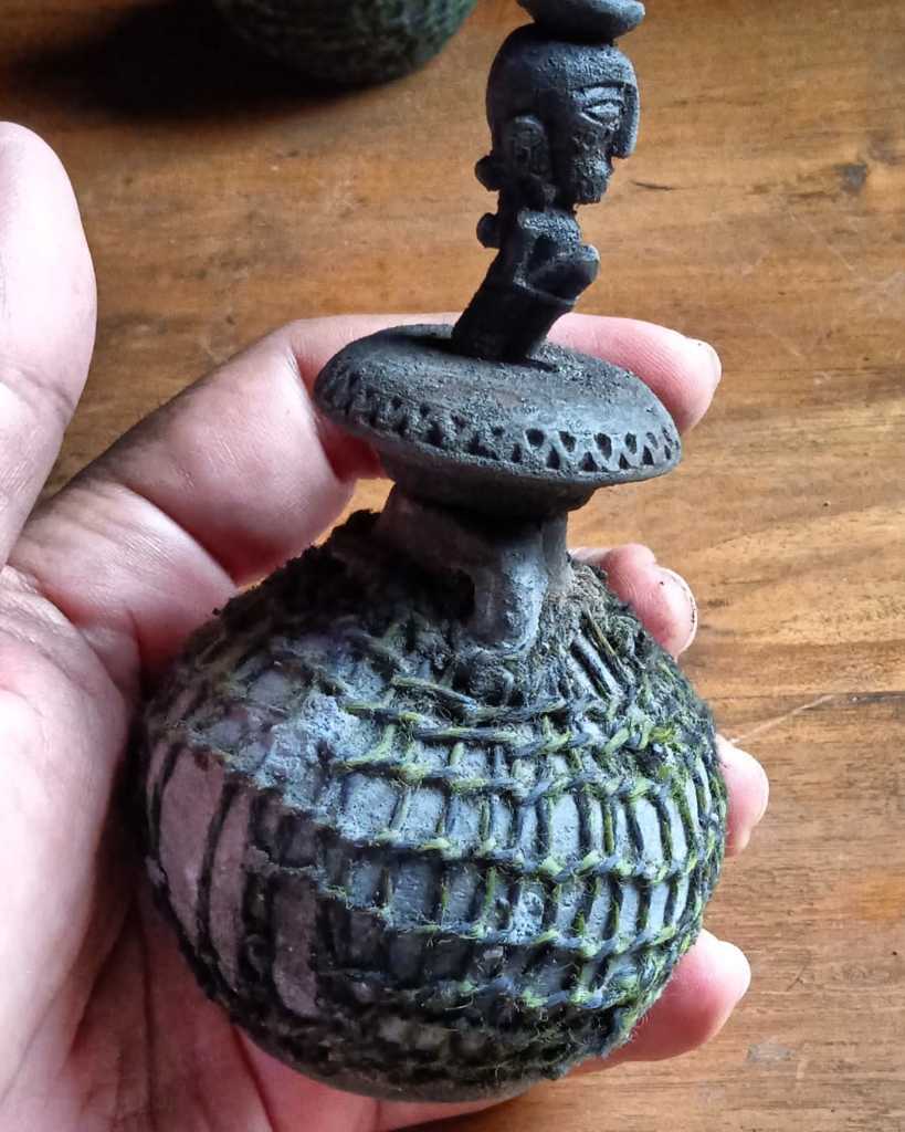 Dengan tutup juga dari tanah liat, diukir berbentuk orang jongkok..