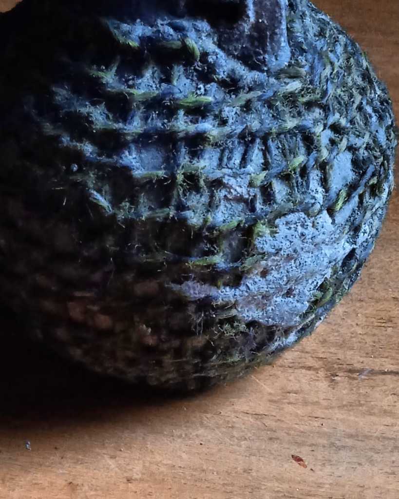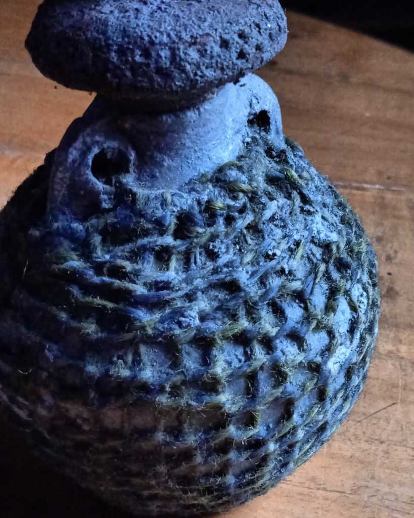 Ukuran kecil (tapi nggak terlalu kecil sekali) dengan bentuk wadah bulat Dari gerabah Yang diikat Rajut pakai benang Hitam.
