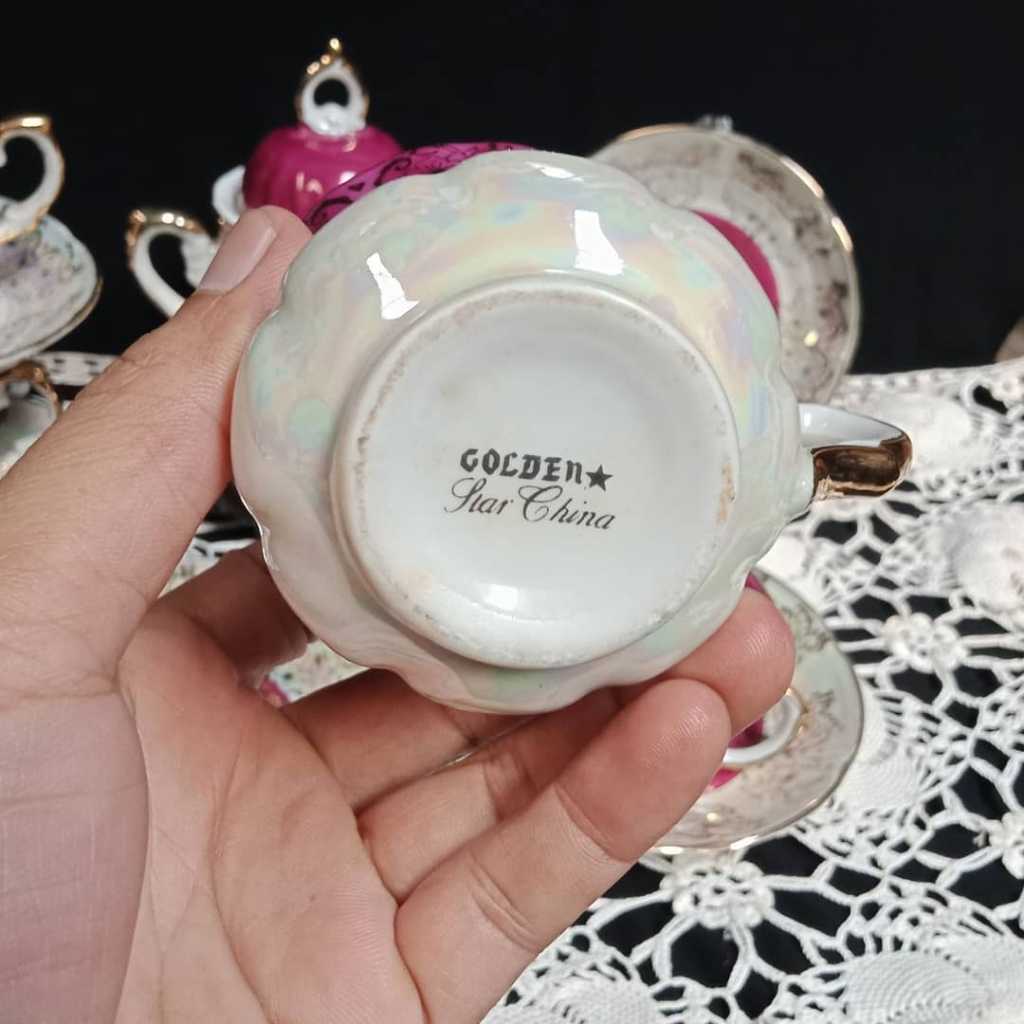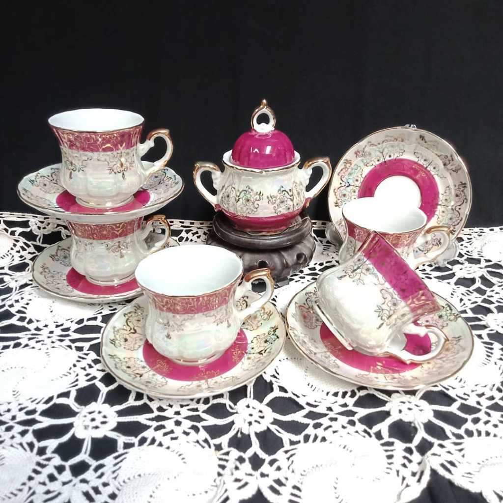 Tea set kurang lengkap.Bentuk cangkir unik.kondisi utuh mulus.Barang Terawat lis emas masih tebal