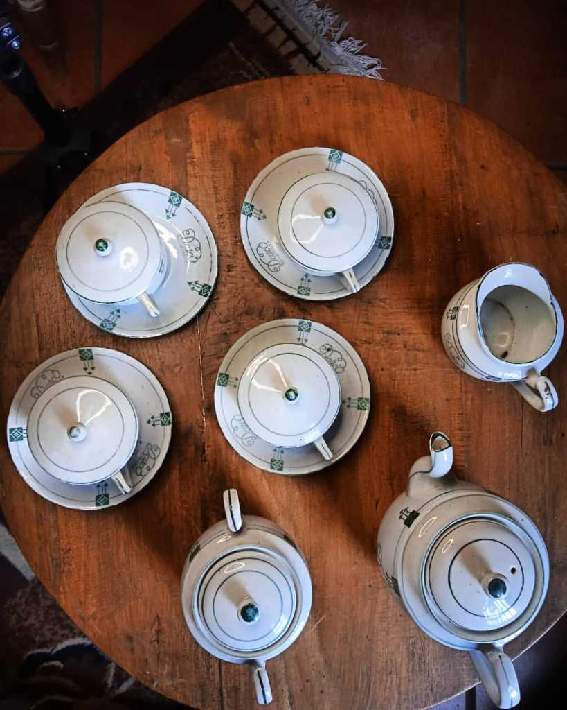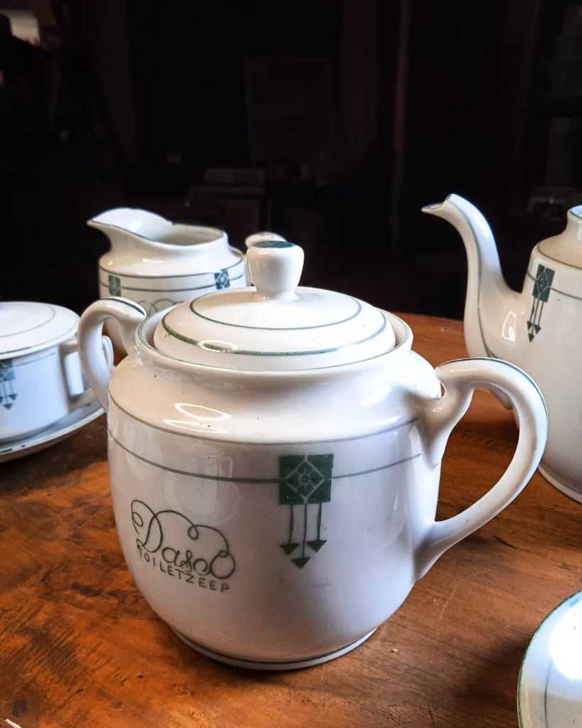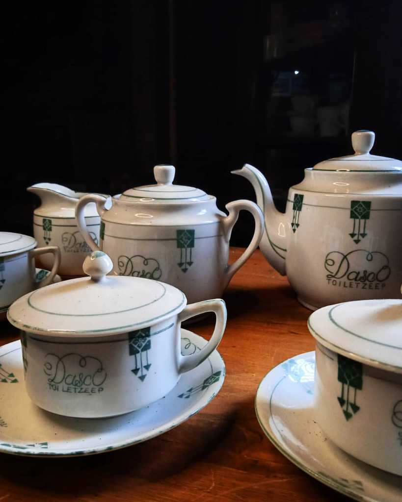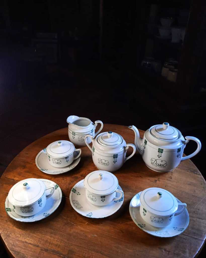 Dengan kondisi yang masih sangat lengkap : Teko, tempat susu, tempat gula, cangkir dan tatakan yang komplit berikut tutupnya.