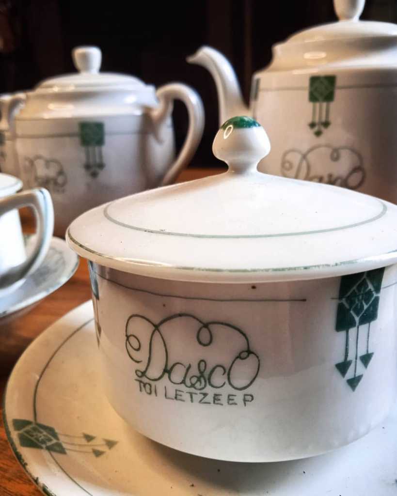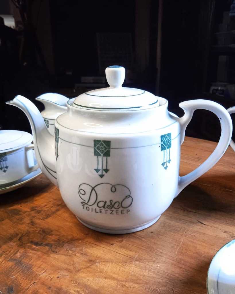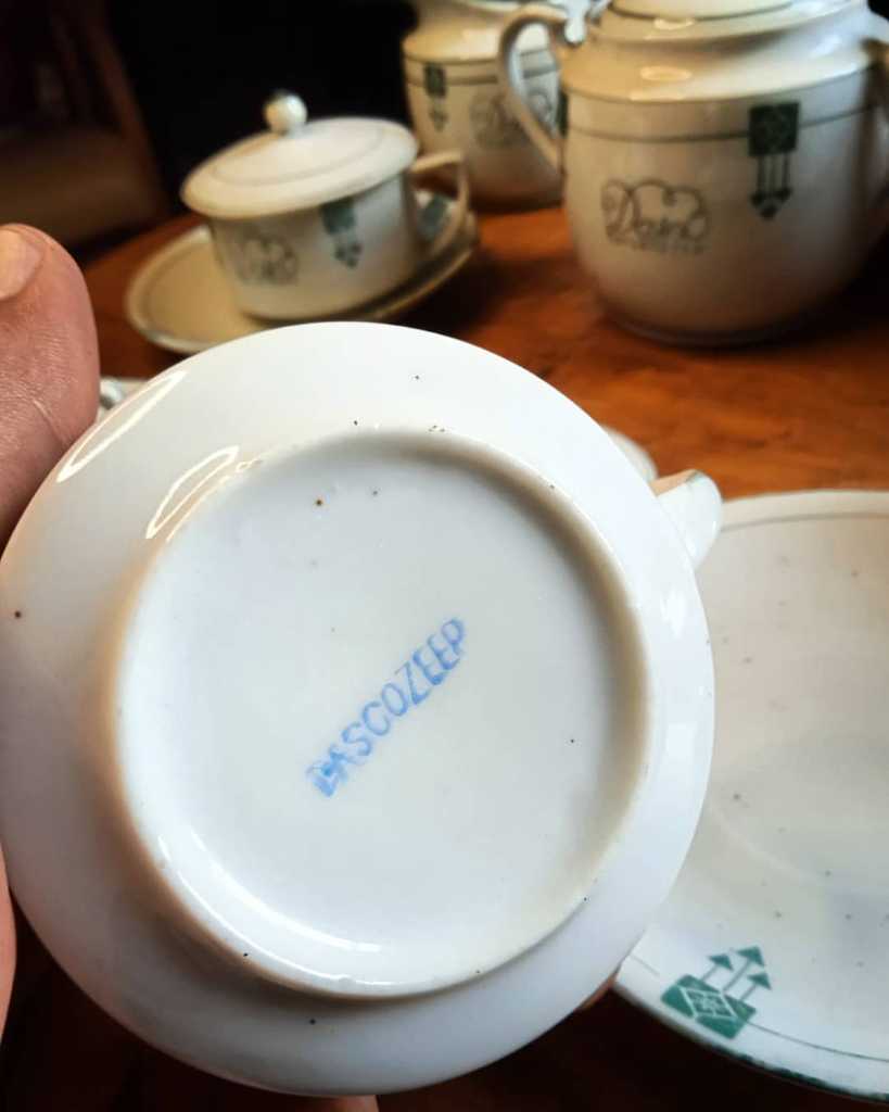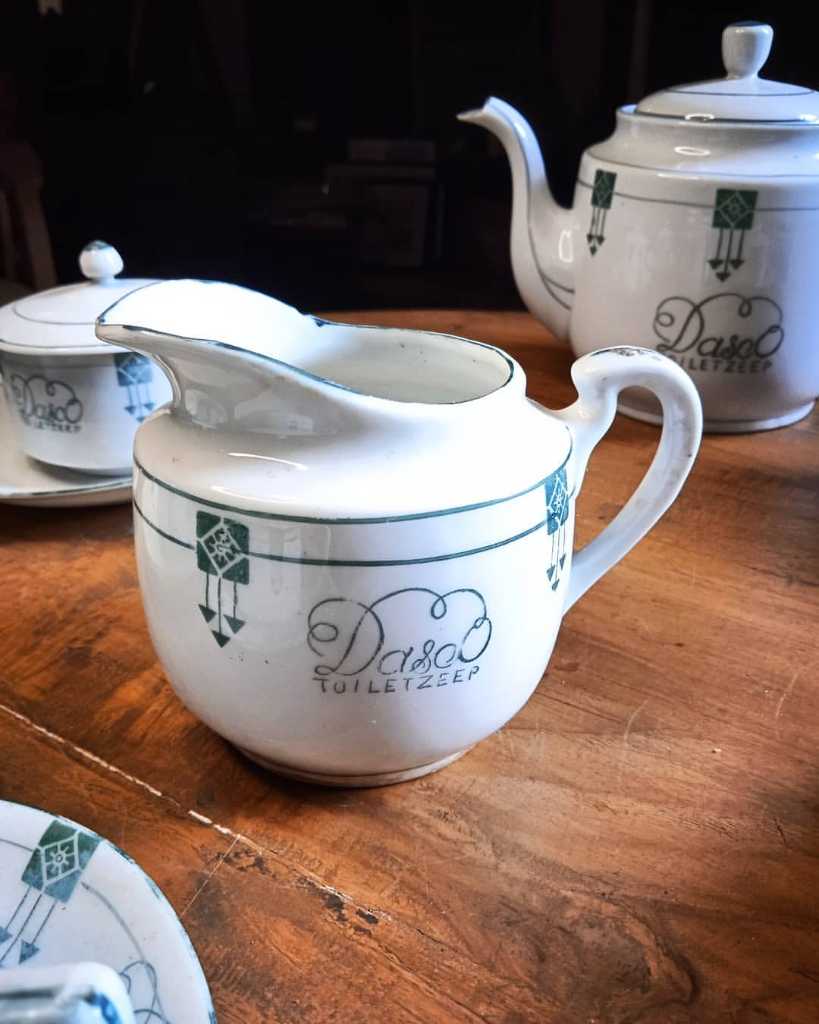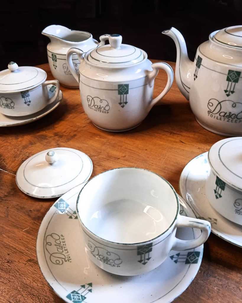 Dengan kondisi yang masih sangat lengkap : Teko, tempat susu, tempat gula, cangkir dan tatakan yang komplit berikut tutupnya.