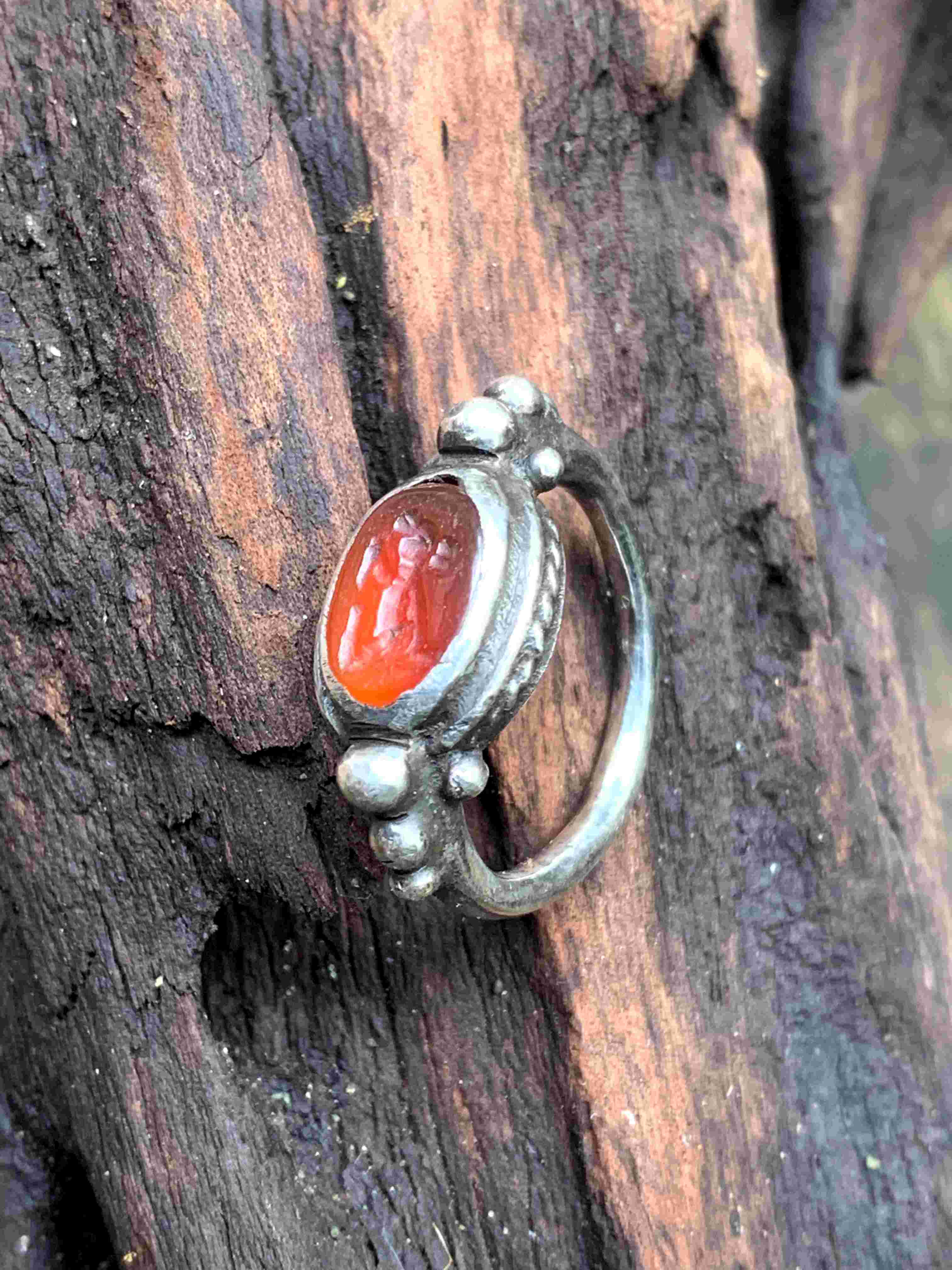 Barang temuan era Majapahit sekitar abad 14-15 M. Ring terbuat dari perak lama (bawaan/asli). Gambar Kelinci, dahulu biasa digunakan sebagai stempel lilin untuk surat menyurat. Diameter 2,5cm atau 18-19. Cincin ini sangat langka, cocok digunakan maupun sebagai koleksi kelas museum. Harga bisa di nego.