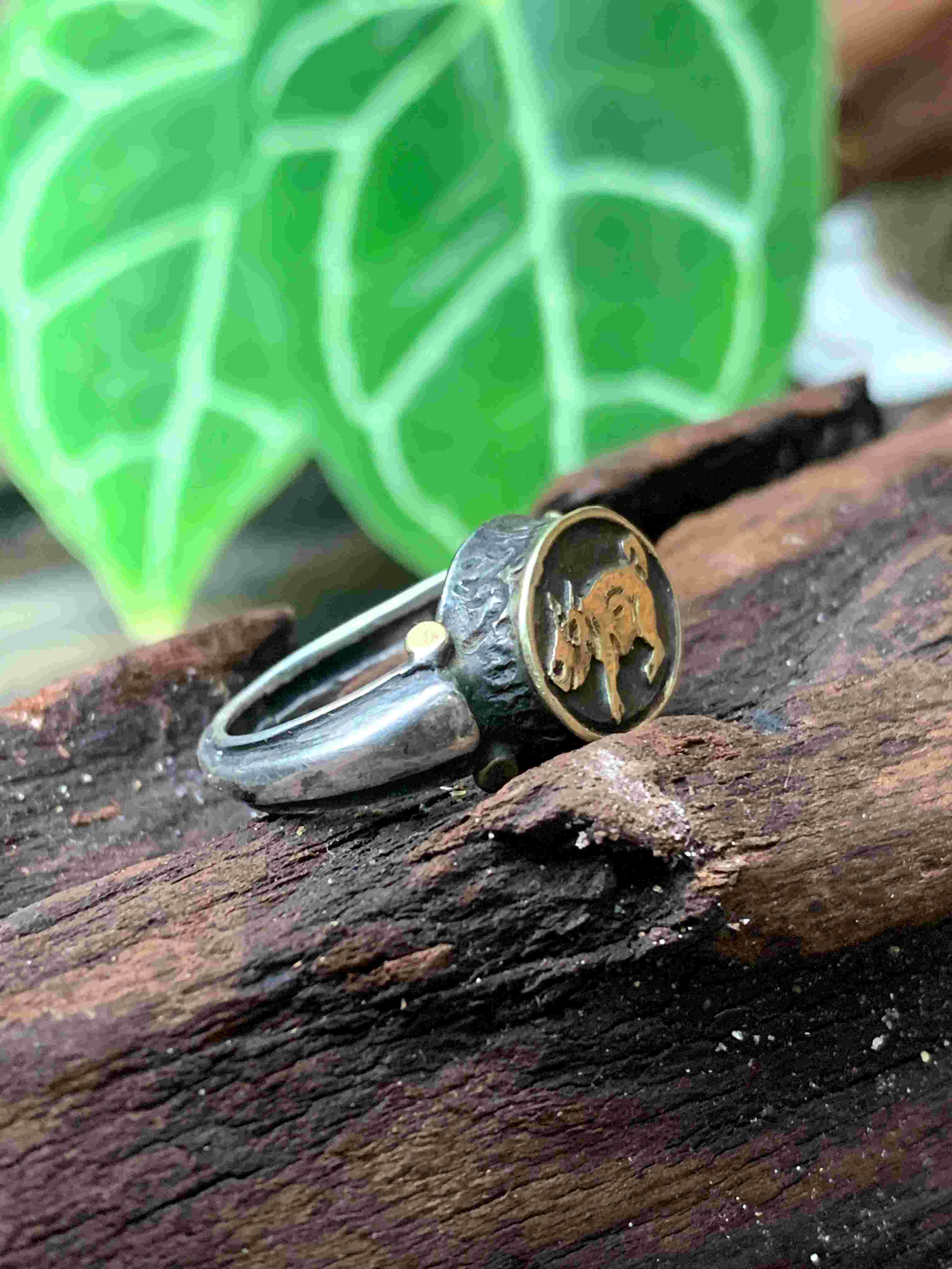 Barang temuan era Majapahit sekitar abad 14-15 M. Bahan terbuat dari perak Dan emas kuno. Gambar pads cincin adalah babi hutan dahulu biasa digunakan sebagai stempel lilin untuk surat menyurat. Diameter 2,7cm atau 19-20. Cincin ini sangat langka, cocok digunakan maupun sebagai koleksi kelas museum. Harga bisa di nego