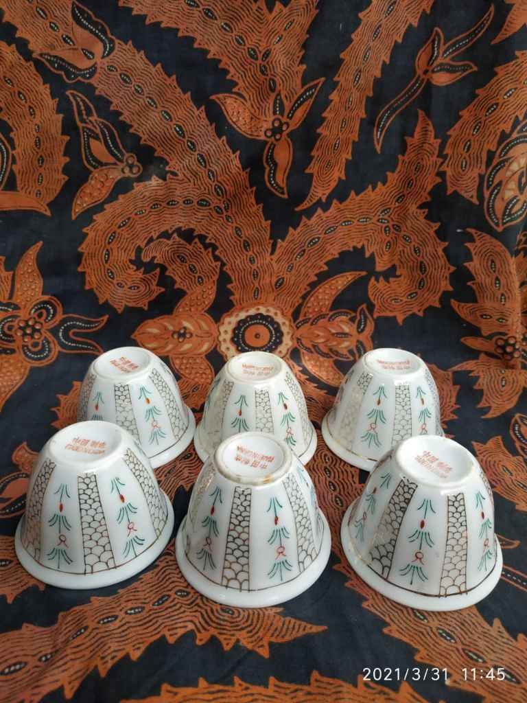 Dijual set dengan isi 6 cawan.Kondisi utuh dan mulus.