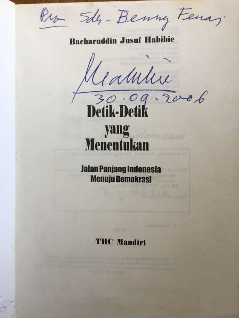 Buku ini ditandatangani langsung oleh pak Habibie untuk pemilik awal buku ini, pak Benny Fenas.