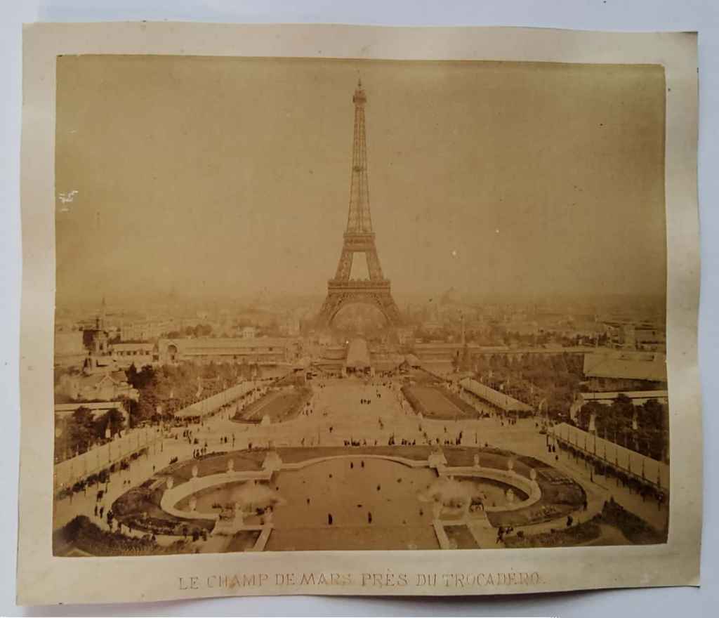 Foto Antik / Foto Kuno "dua muka" (LE CHAMP DE MARS PRES DU TROCADERO - LA TOUR EIFFEL); estimasi tahun 1900-an awal; ukuran 28cm x 22cm