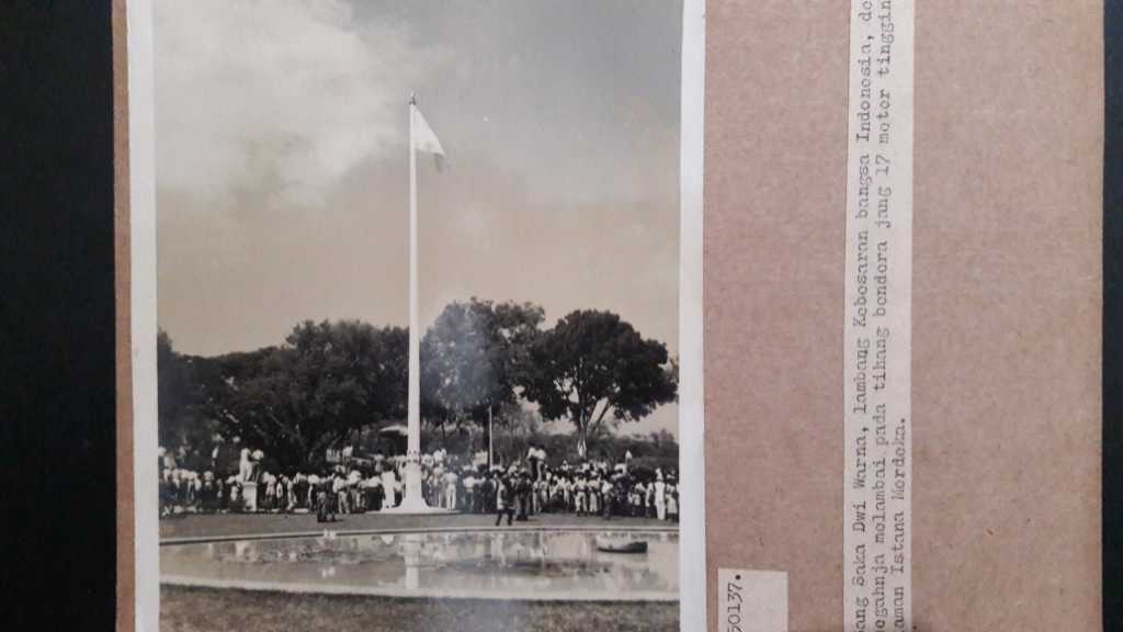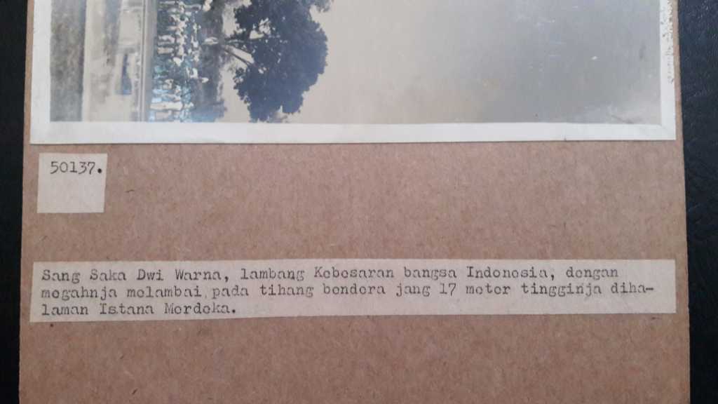 Sang Saka Dwi Warna, Lambang Kebesaran bangsa Indonesia, dengan megahnja melambai pada tihang bendera jang 17 meter tingginja dihalaman Istana Merdeka