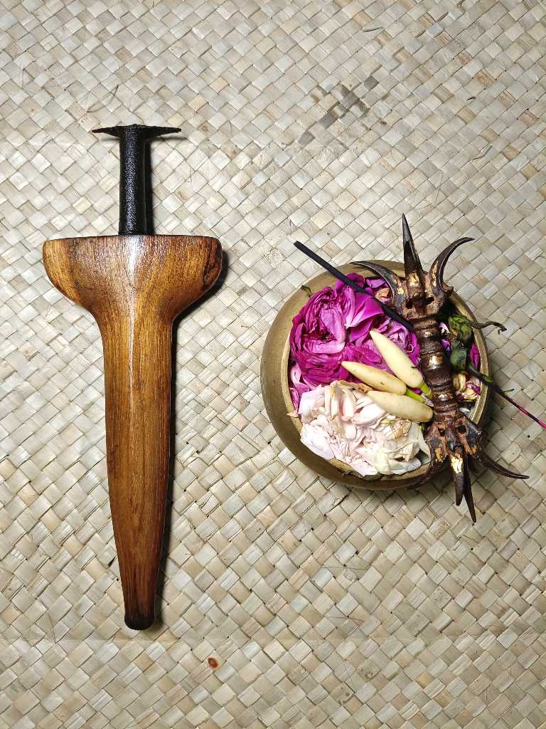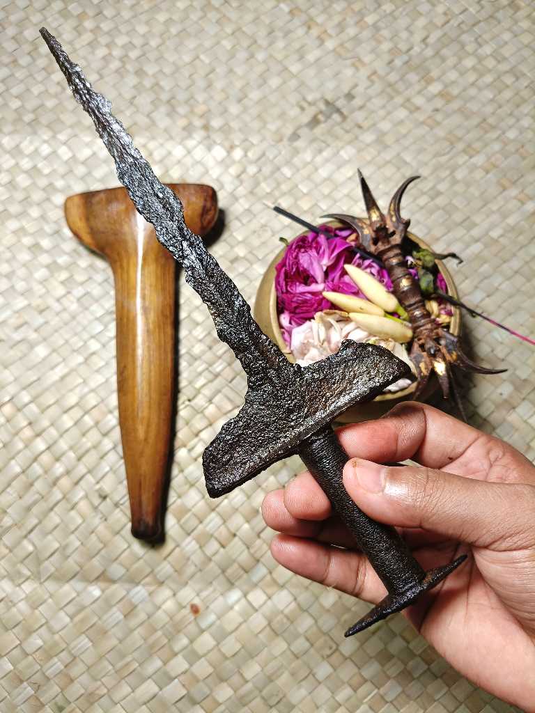 Relief kedua menggambarkan tokoh Laksmana menghunus senjata pendek membunuh para raksasa. Senjata yang digunakan memiliki kemiripan dengan keris budha yang kita kenal sekarang. Bilahnya mulai tampak asimetris, gemuk, tebal, mempunyai sedikit condong leleh, terlihat pula ricikan lain seperti gusen dan odo-odo. Selain itu senjata ini memiliki ganja dan bagian hulunya masih dilengkapi semacam penahan seperti kadga.