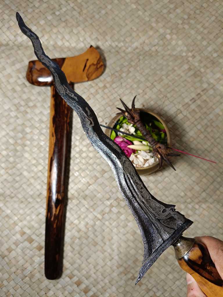 Keris Panimbal Majapahit Luk 9, begitulah yang selama ini sebagian Pecinta Keris Pusaka Nusantara percaya dengan memilikinya diharapkan Koleksi Pusakanya bisa Bertambah Banyak , atau secara bahasa Panimbal artinya Pemanggil , Ada kepercayaan unik di kalangan pecinta keris. Mereka yang mendalami dunia isoteri tosan aji percaya bahwa keris panimbal merupakan salah satu magnet pemanggil keris-keris lain yang ingin atau belum dimiliki. Pada zaman dahulu adalah suatu kehormatan besar jika seorang Abdi Dalem di-timbali (dipanggil menghadap) Ngarsa Dalem (Raja). Biasanya ada sesuatu yang dianggap sangat penting atau sifatnya urgent (mendadak) sehingga titah atau dhawuh-nya (perintah) harus disampaikan langsung. Hanya orang-orang terdekat atau kepercayaan sang Raja atau istilah sekarang ini adalah “Ring Satu Istana”, yang akan mendapat kehormatan dan kepercayaan itu. Keris Panimbal ini didapatkan dalam kondisi yang utuh kelengkapannya , Warangkanya yang termasuk utuh lamen berbahan Kayu Timoho model Gayaman Jawa Timuran yang sangat menarik dan indah coraknya. Sehingga kami dengan mudah merestorasinya hanya perlu membersihkan bilahnya dan sedikit mempoles warangkanya agar memancarkan keindahan pada masa lalunya.