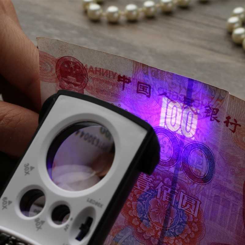 Kaca pembesar saku 30x 60x 90x 2 led uv ultraviolet
