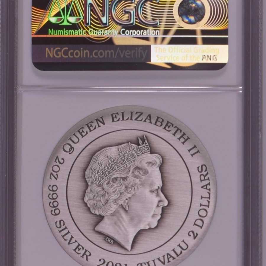 Koin Perak Silver 2oz .999S$2 Tuvalu 2021Dragon & TigerNGC MS70 AntiquedFirst Releases