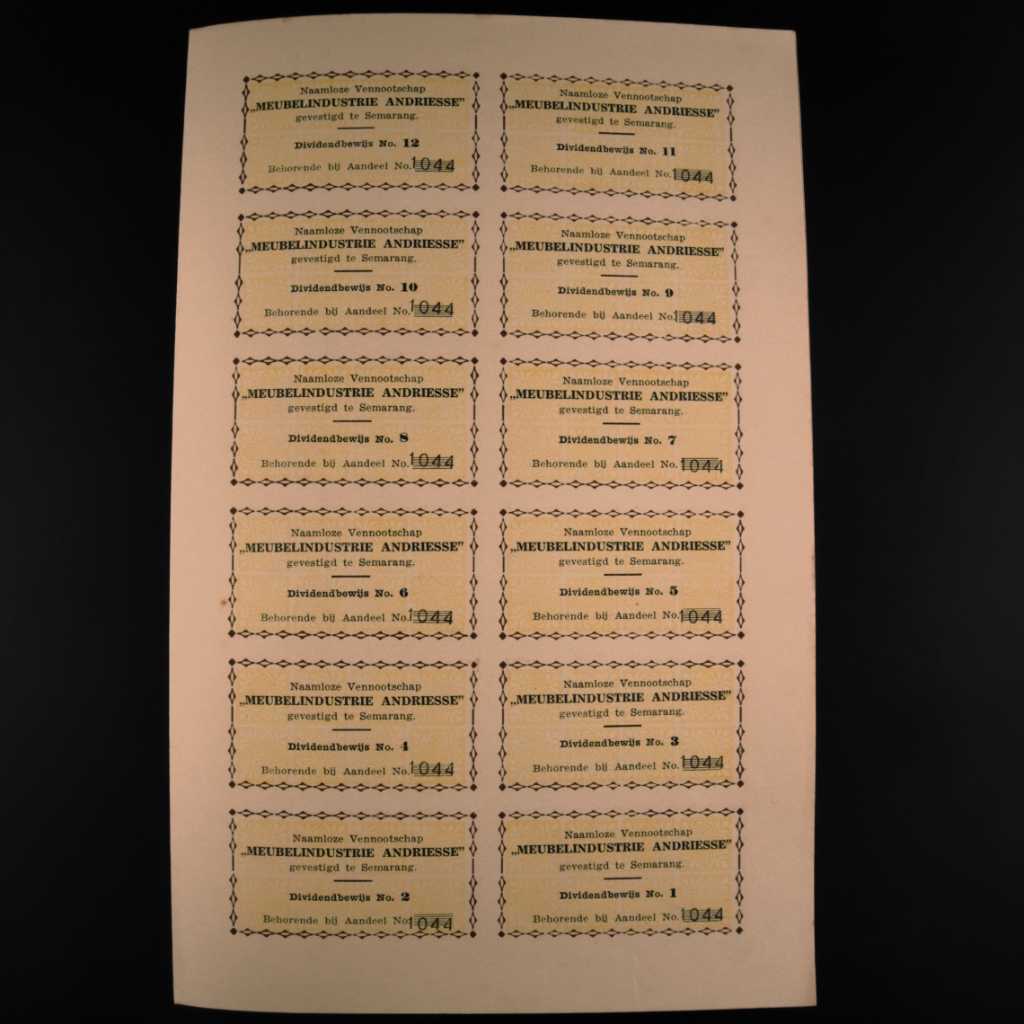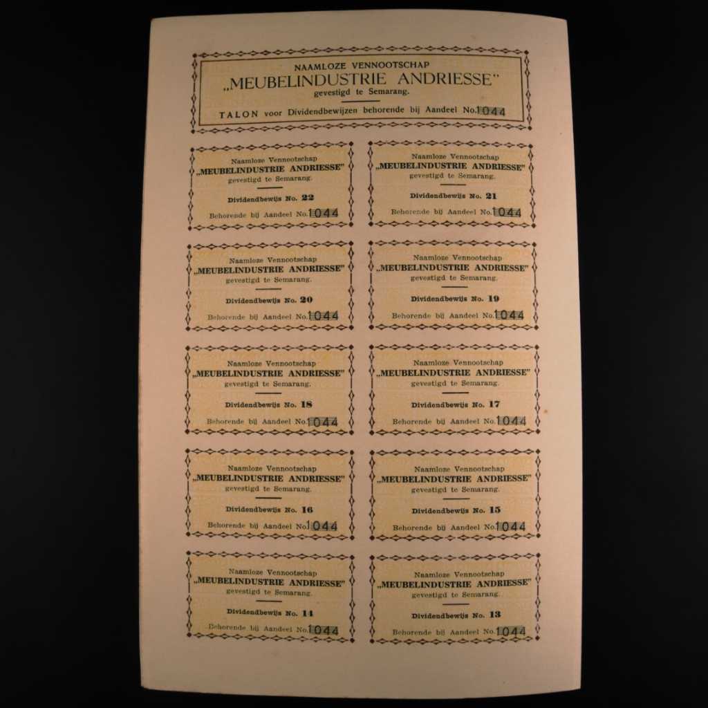 Sertifikat saham dari perusahaan bernama "Meubelindustrie Andriesse" berlokasi di Semarang, Indonesia. Berikut adalah detail dari sertifikat tersebut: