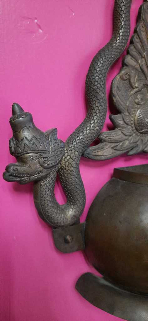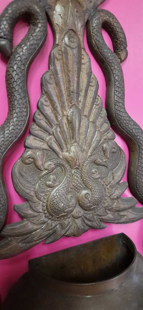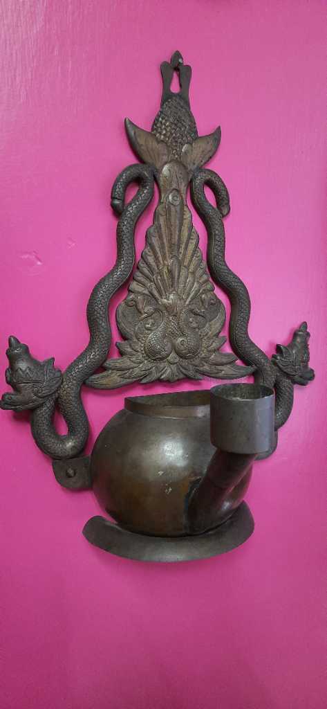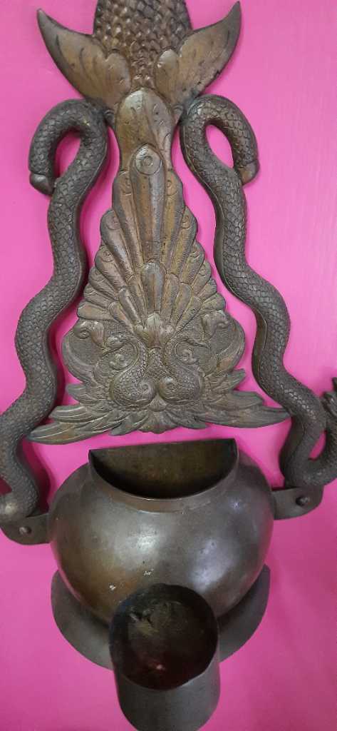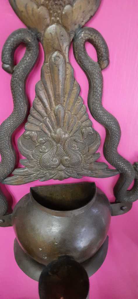 Lampu minyak blencong buat pagelaran wayang kulit motif ular bahan brass ukuran 40x30cm utuh