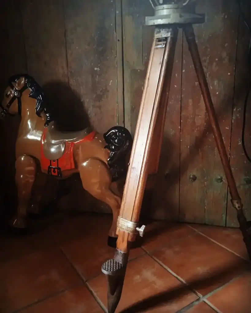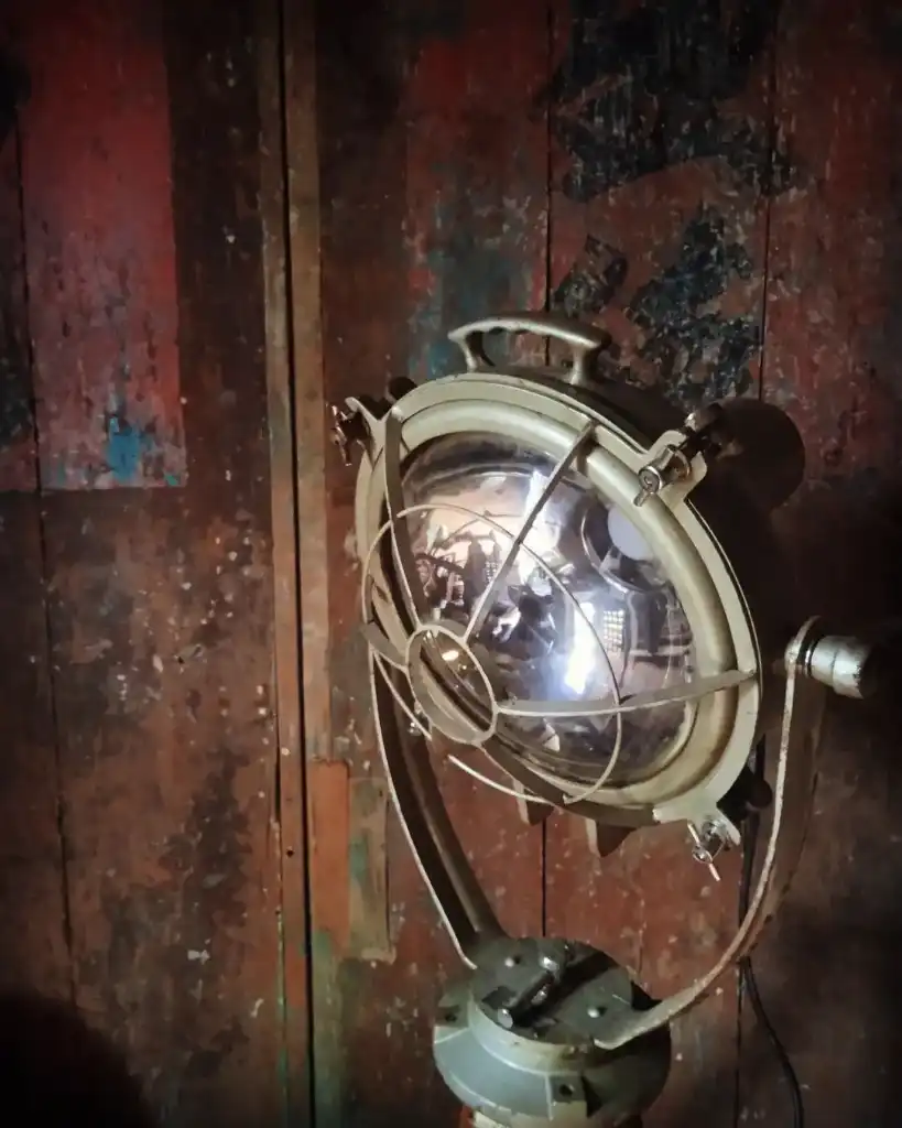 Material lampu ex lampu sorot kapal (made in Japan), Di padukan dengan tripod kayu ex theodolite lawas.