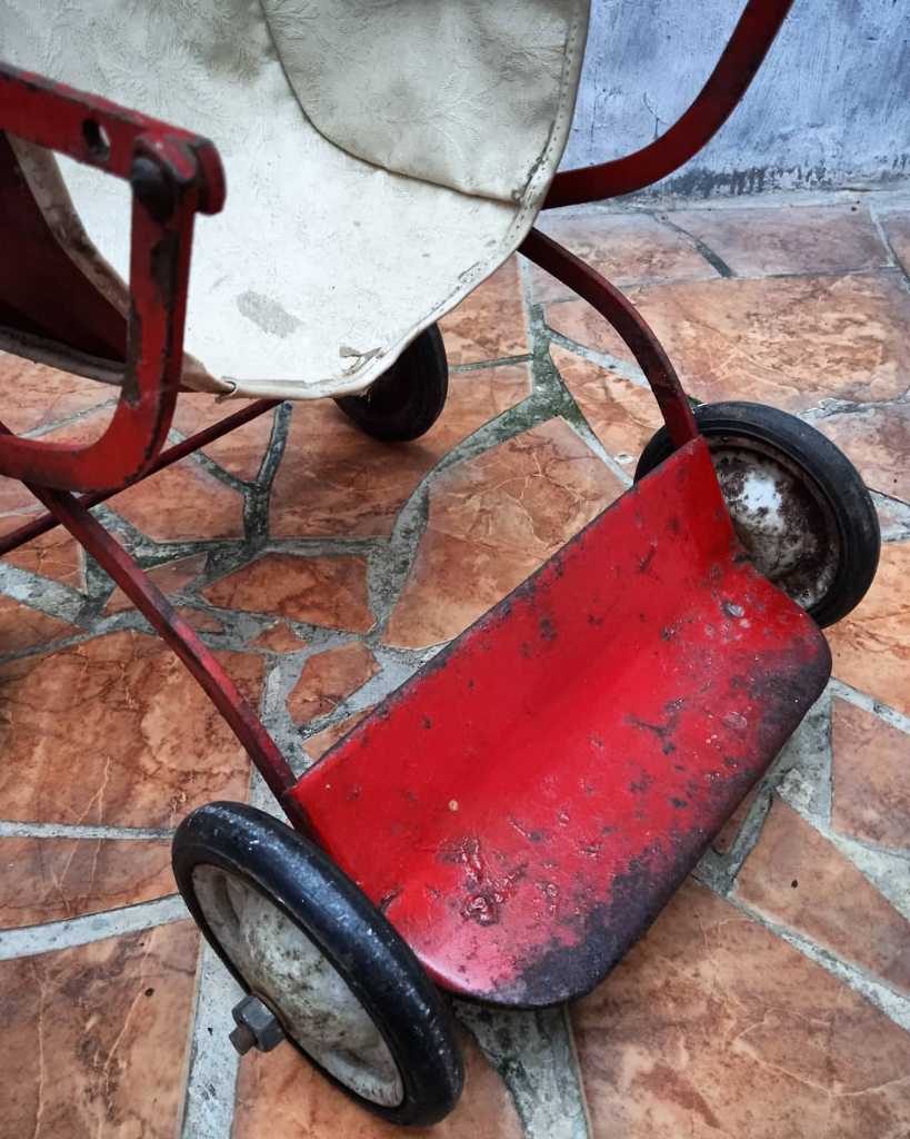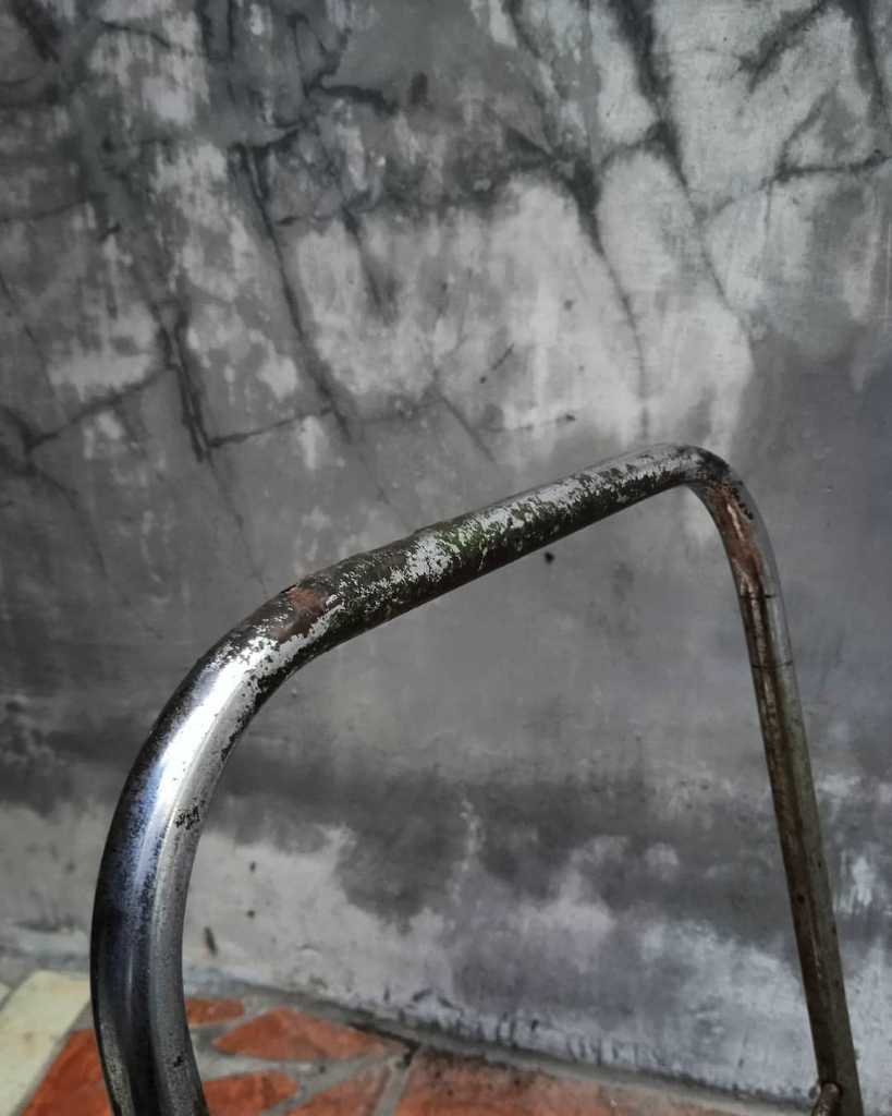 Merek sdh hilang. Bahan rangka dari besi, pijalan kaki plat besi, alas duduk plastik llentur tebal, roda besi balut karet keras. Minus pegangan tangan bagian atas kanan sedikit berkarat, dan pijalan kaki sedikit karat, dan roda bagian dalam sedikit berkarat.