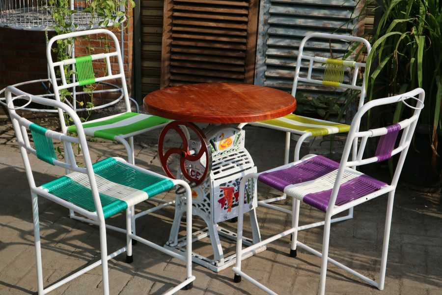 Meja industrial dari serutan es jamam dulu dan kursi besi dengan alas sandaram dari karet pentil