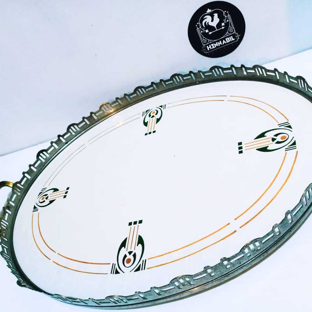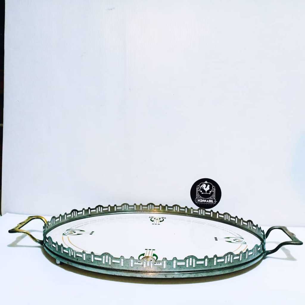Nampan atau baki kunoBahan porcelainRingi bahan kuningan lapis perakUkuran :Panjang 51cmLebar 30cmPanjang ring 40cm