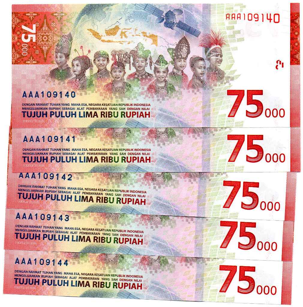 Nama barang : Uang Indonesia UPK 75000 Rupiah Edisi Kemerdekaan 75 Tahun Urut 5 Lembar