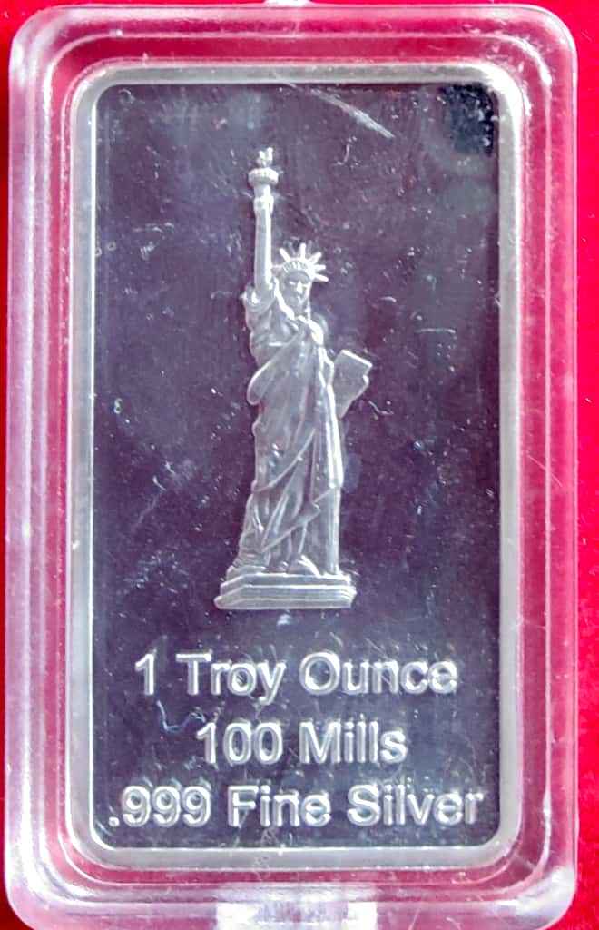 Tampak depan bertuliskan: 1 Troy Ounce 100 Mills .999 Fine Silver