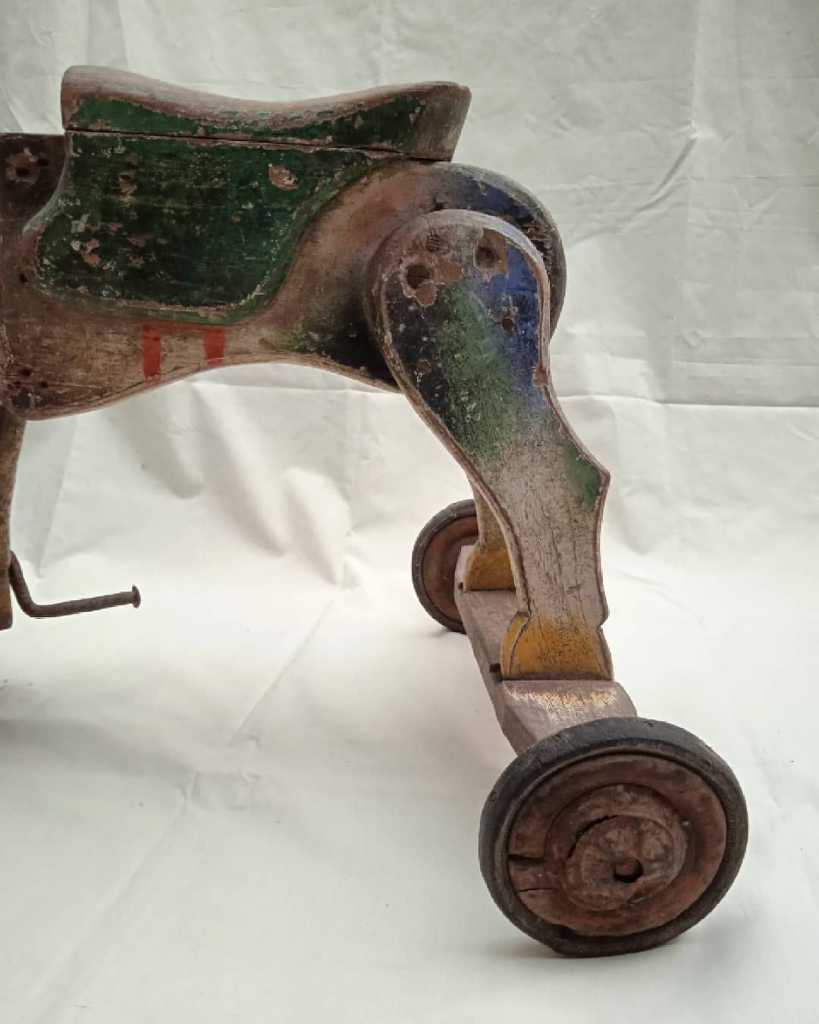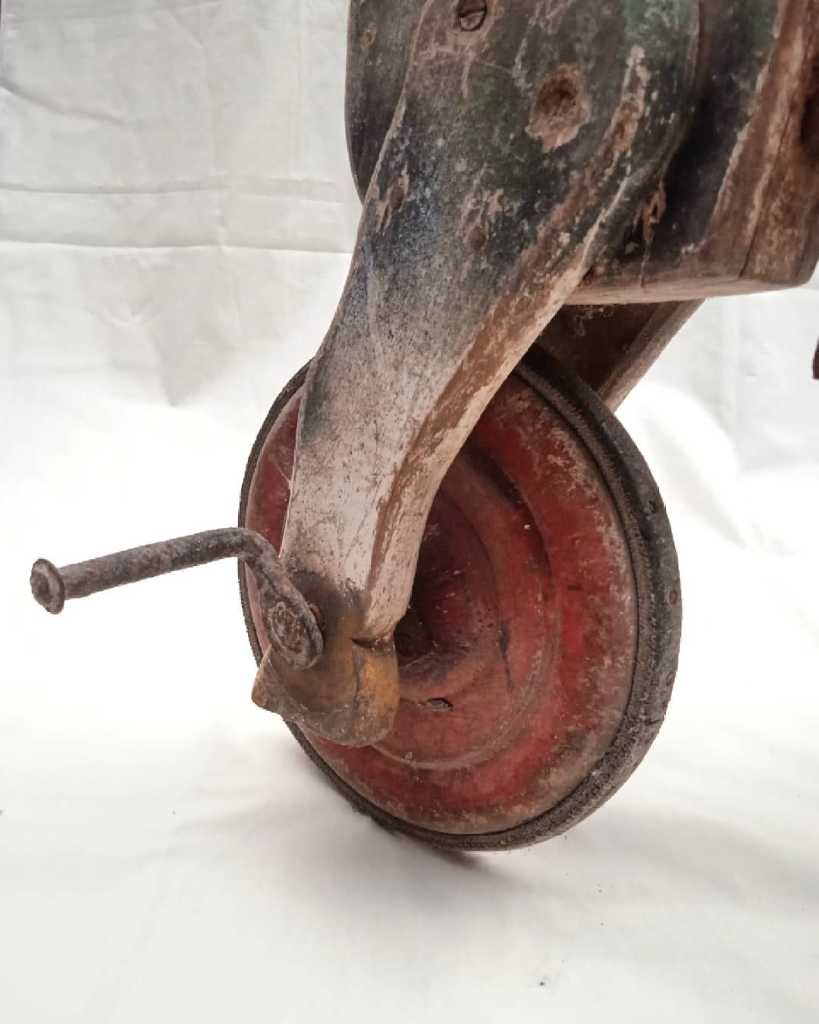 Body kayu, roda kayu dibalut karet, engsel buat belok besi.