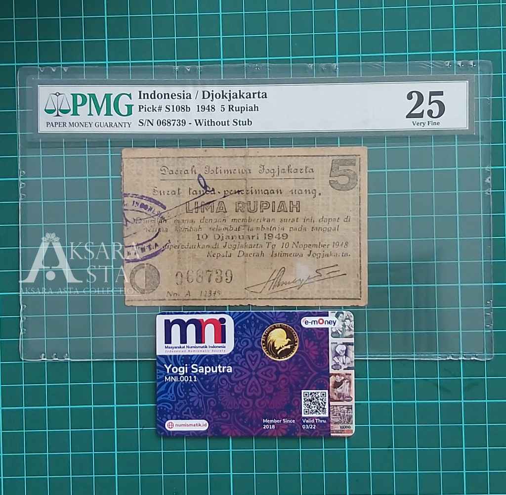Nama barang : Super Rare ORIDA - Indonesia/DJokjakarta 5 Rupiah Th 1948 PMG 25