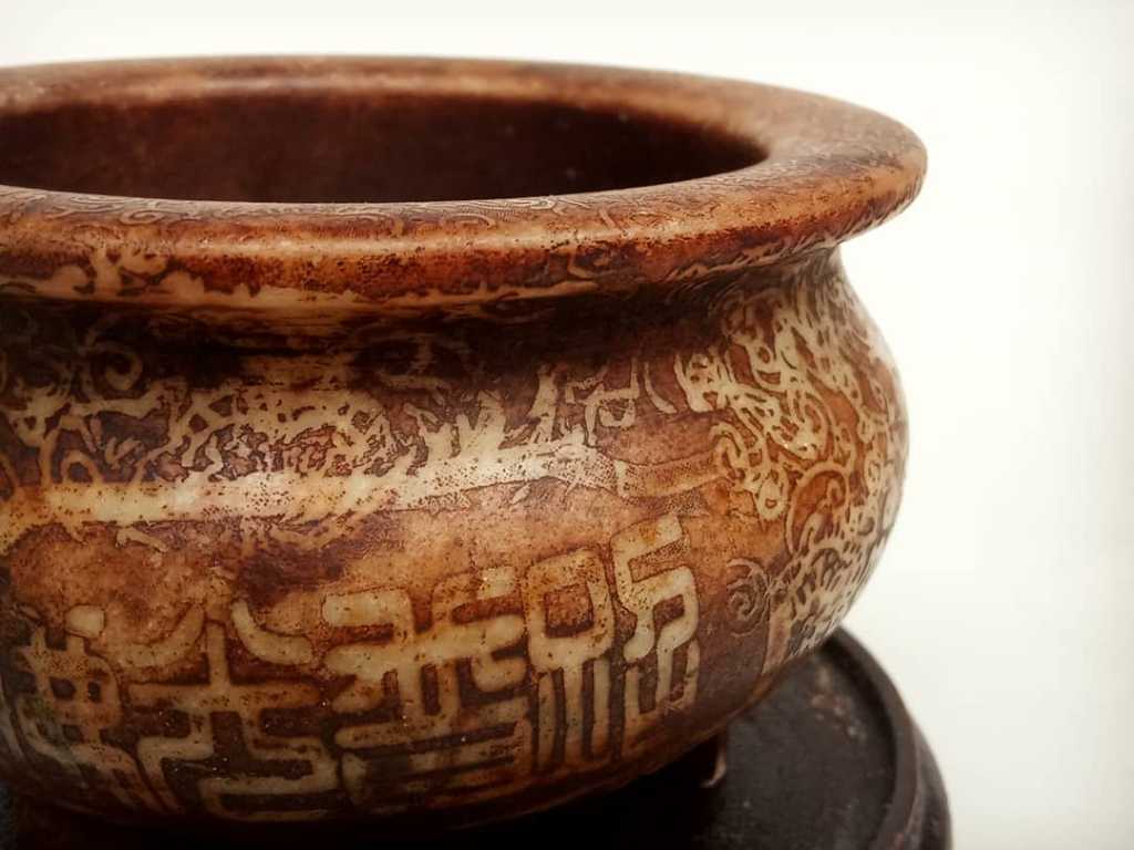 Tempat Bakar Dupa bahan Batu (mungkin giok muda, karena di Senter tembus cahaya) dengan motif.