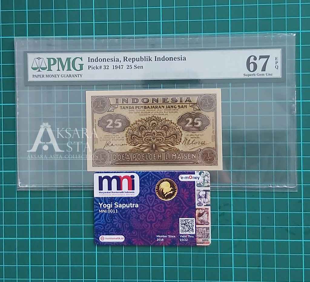 Nama barang : Uang Indonesia 25 Sen Th 1947 PMG 67 EPQ