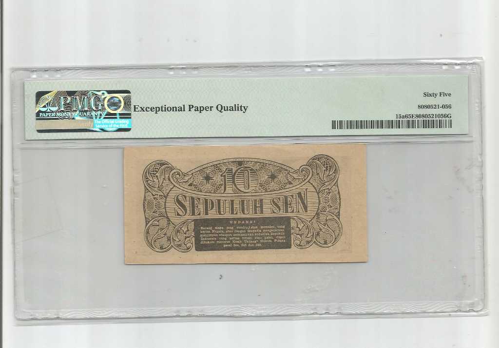 Nama barang : Uang Indonesia Rp. 10 Sen Thn. 1945 PMG 65 EPQ