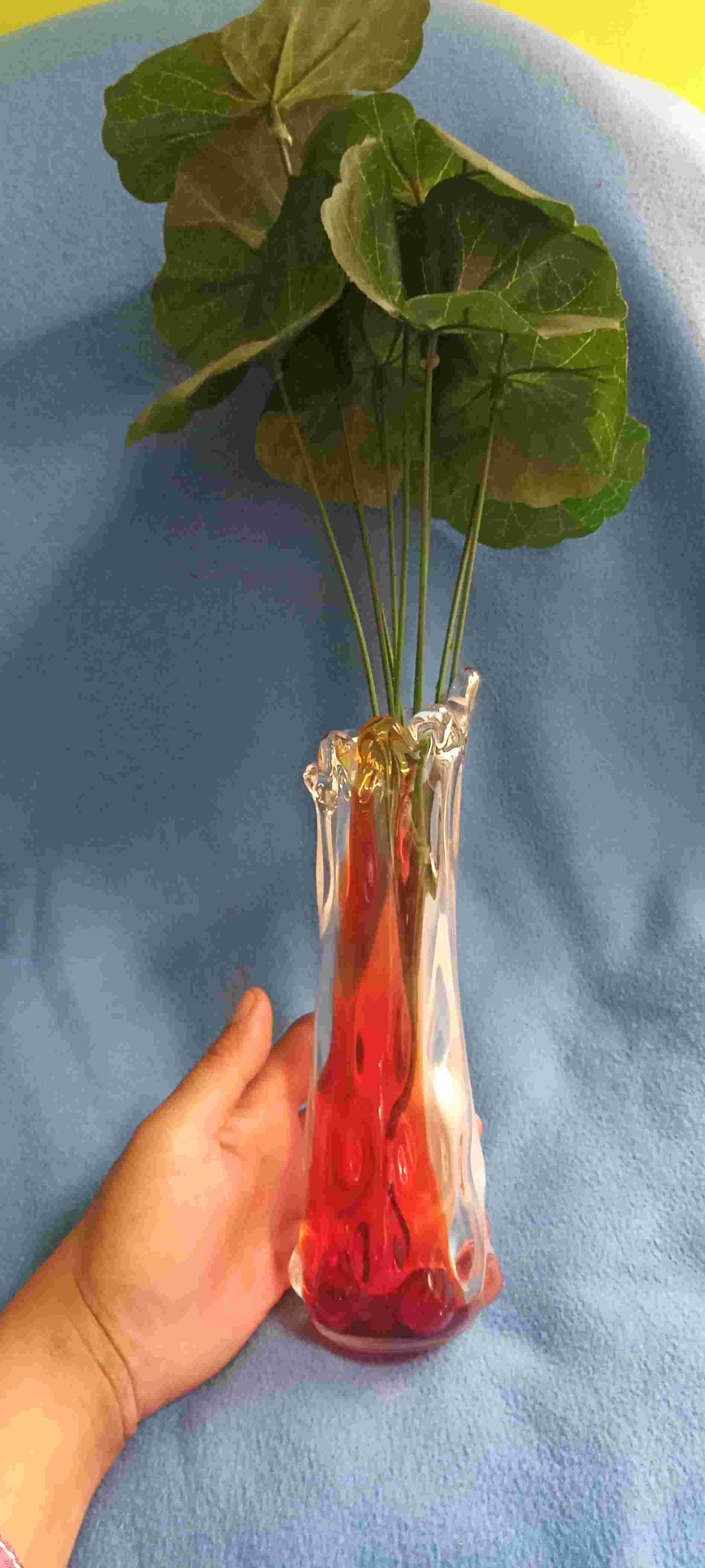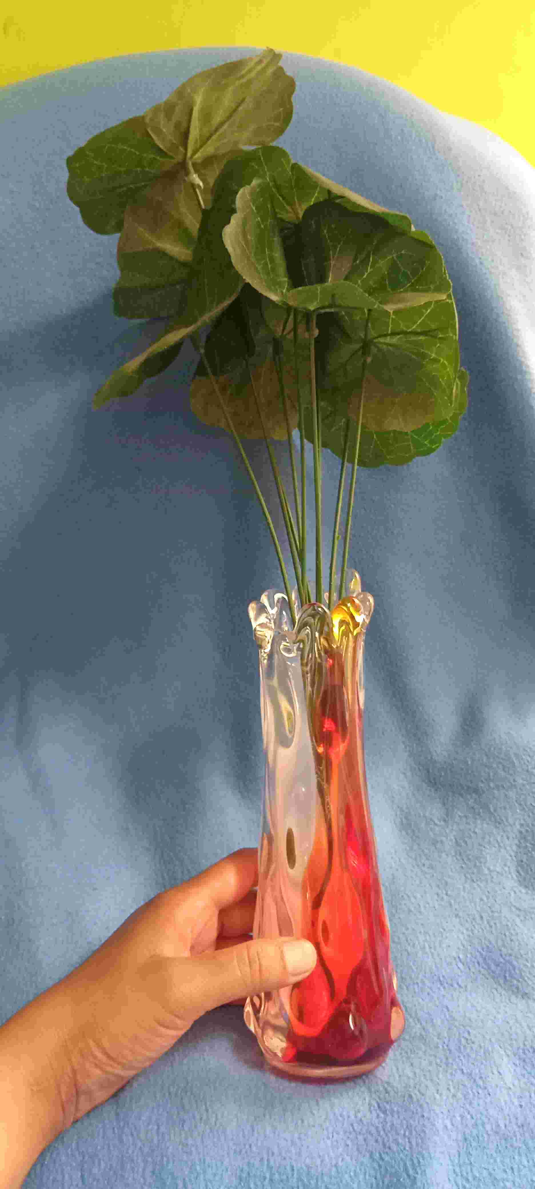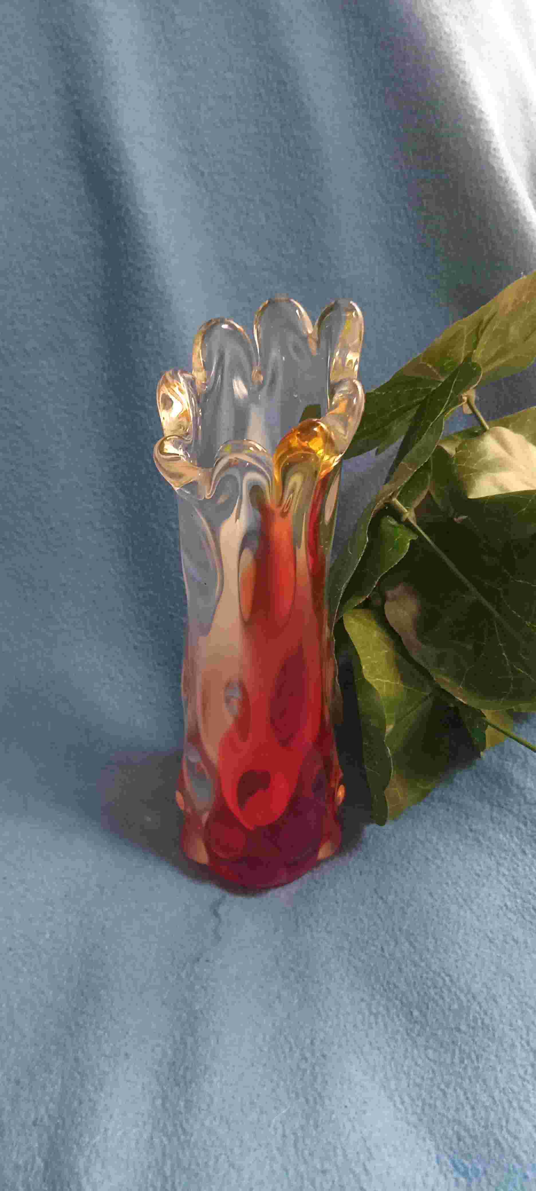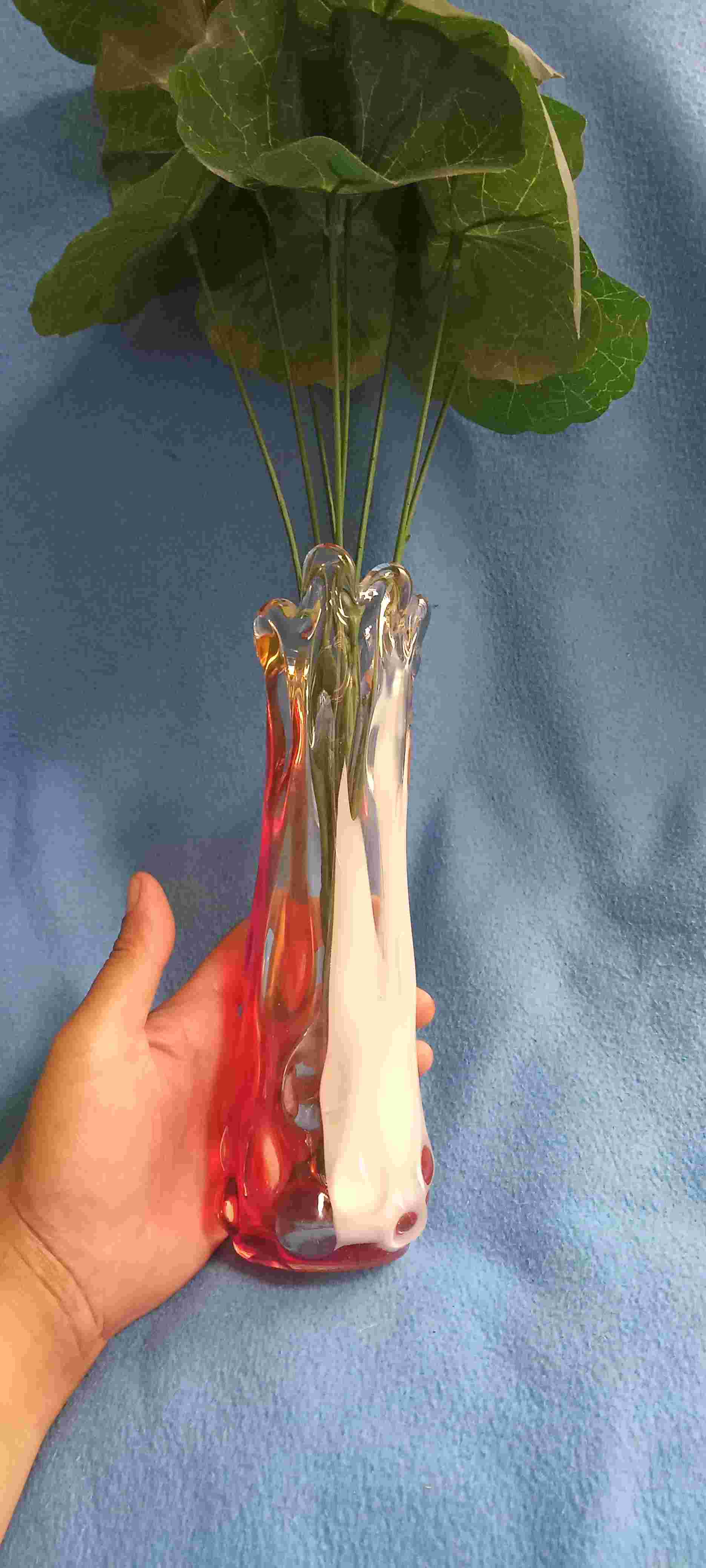 Vas bunga bohemian, hand blown system warna jingga, putih susu dan bening, ukuran berat 400g, tinggi 21cm, lebar 5cm diameter 7cm kondisi mulus terawat baik tidak ada retak