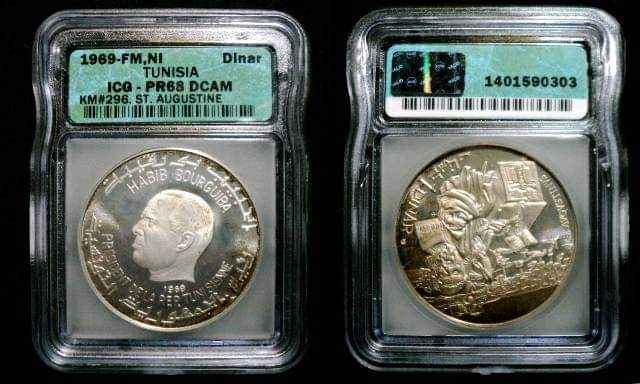 1969 Tunisia Silver Dinar: History SAINT AUGUSTINE V ICG PR 68.