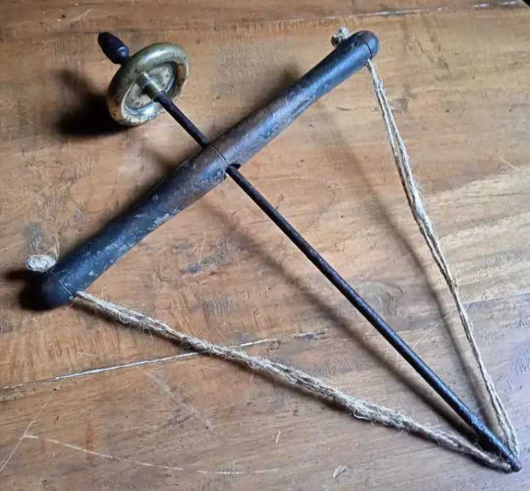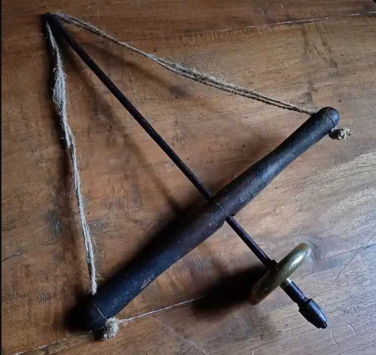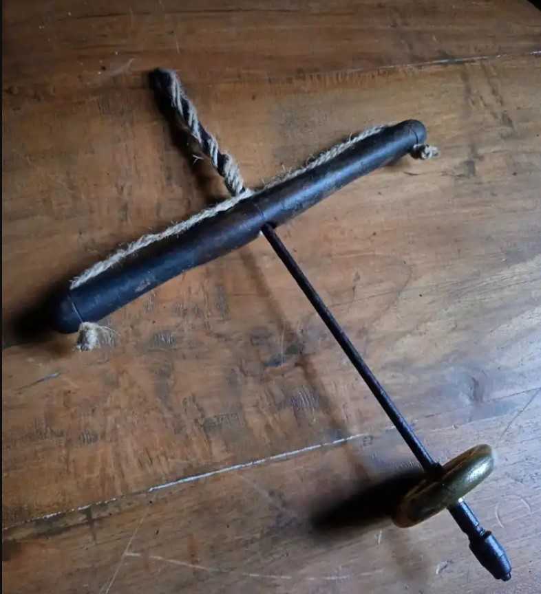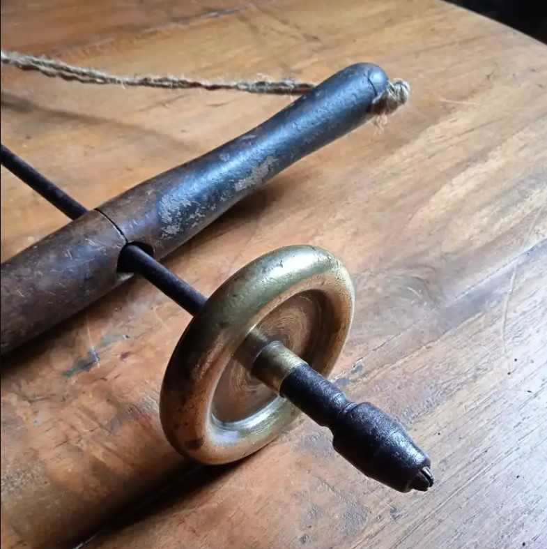 Roda kuningan sebagai pemberat yang seimbang sempurna membuat Bor Archimedes berputar ke arah bergantian saat gagang kayu dinaikkan dan diturunkan dengan mulus.