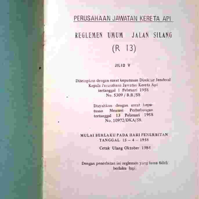 Buku Tentang Kereta Api Perusahaan Jawatan Kereta Api REGLEMEN UMUM JALAN SILANG (R 13) Jilid V Cetak Ulang Oktober 1984 Kondisi Utuh, 11 Halaman Komplit