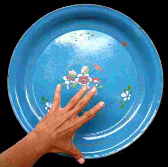 Nampan Enamel Biru Antik Lukis Timbul Diameter : 40cm Kondisi Utuh Minat Silahkan