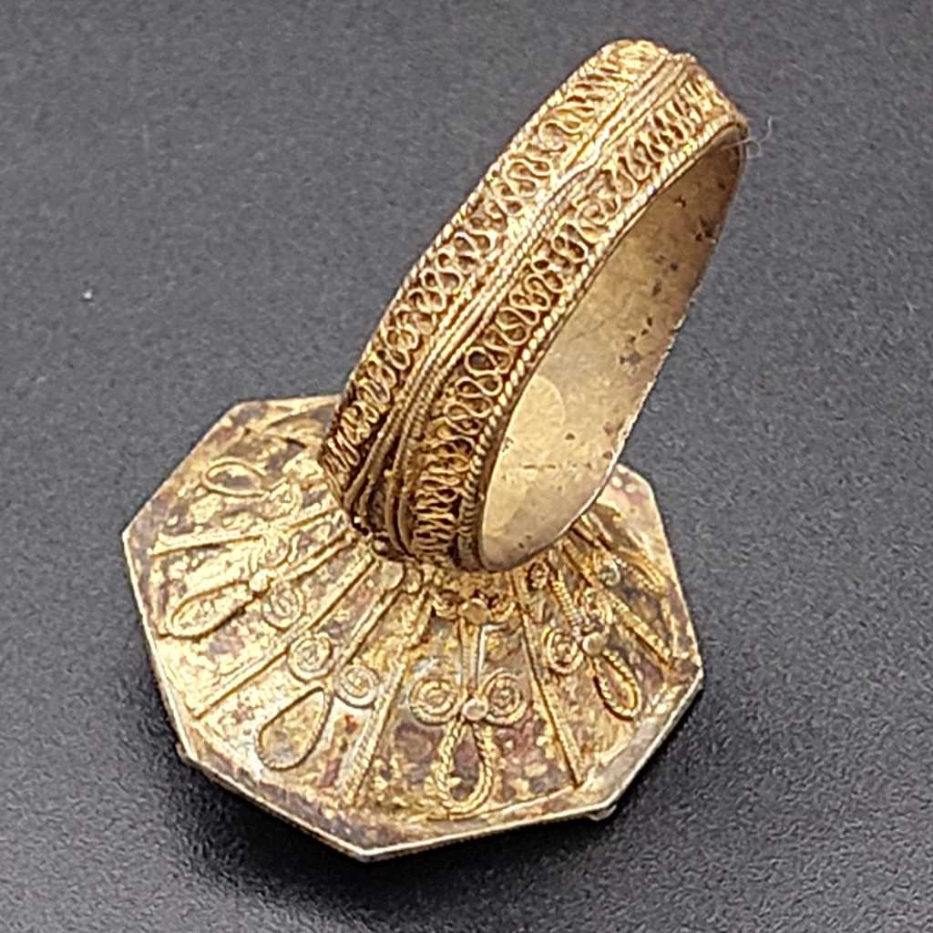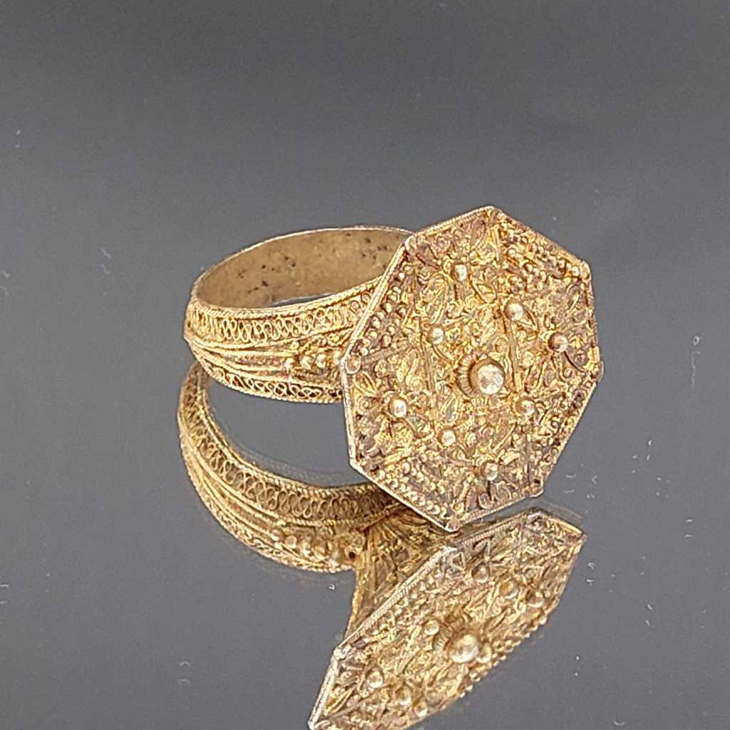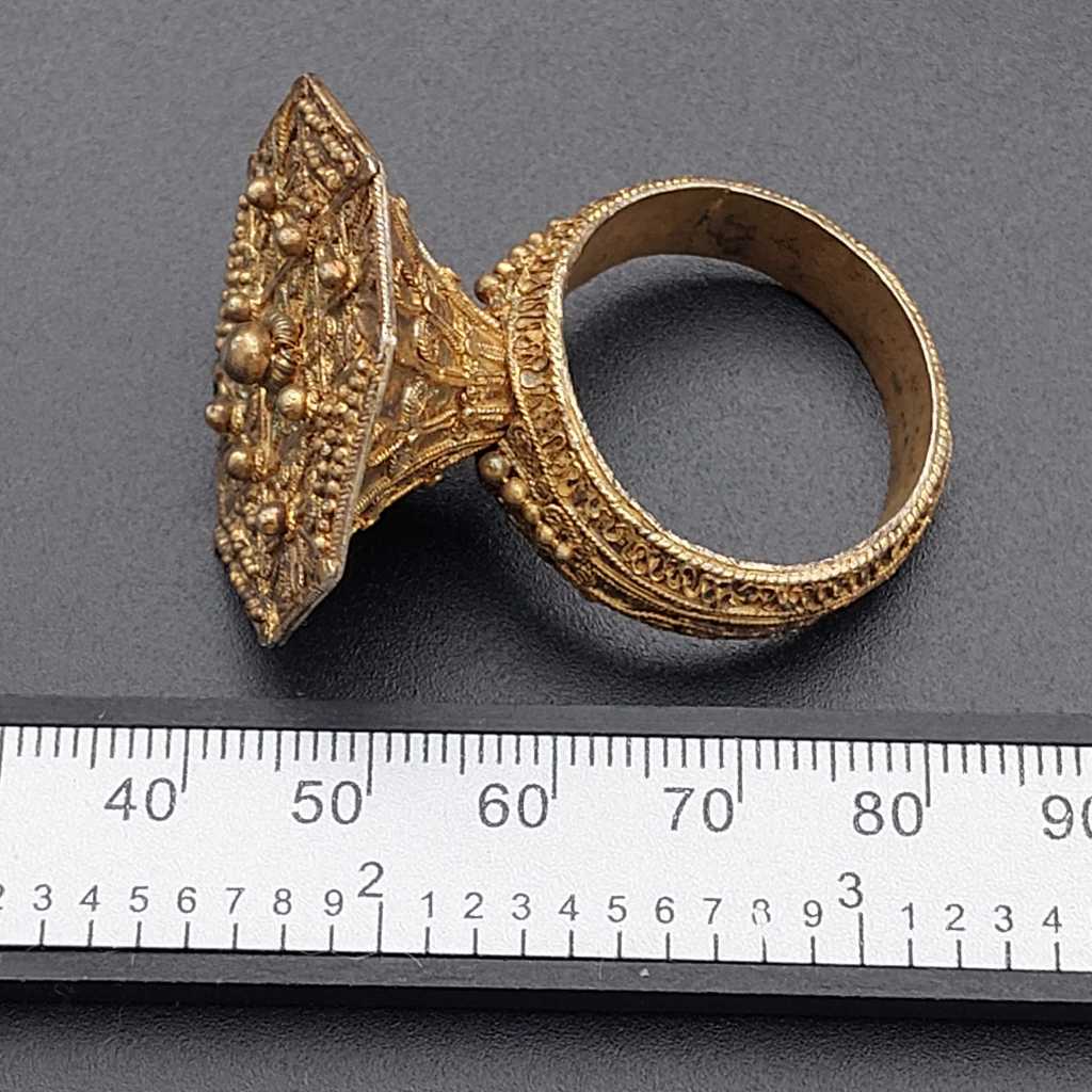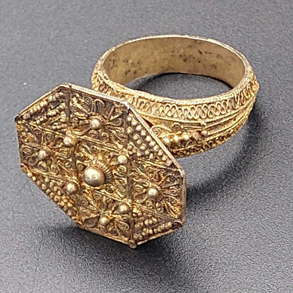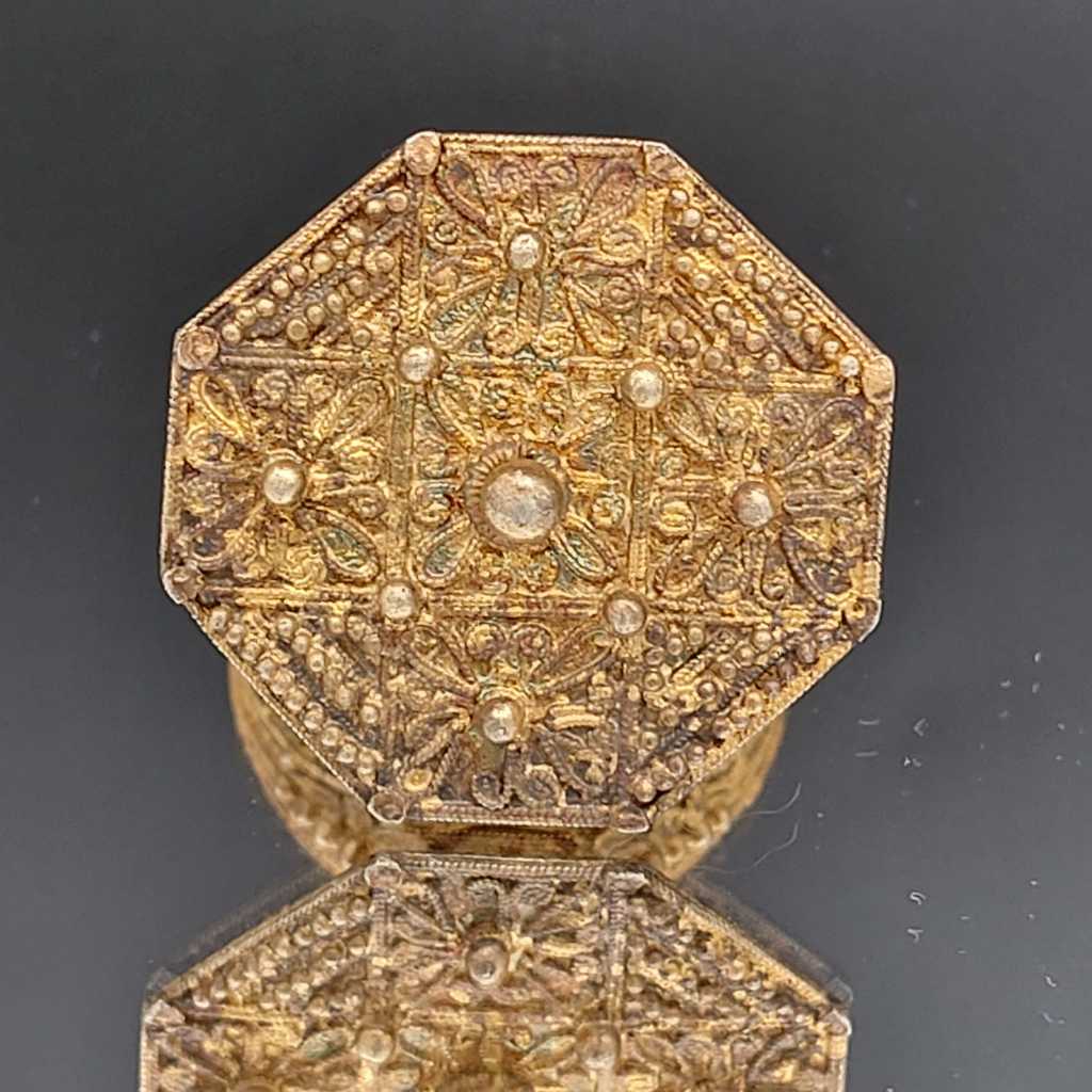 Cincin emas Karo-Batak (cincin topak gajah)Cincin ini terbuat dari emas dan perak dengan permukaan segi delapan ditempatkan tinggi yang disolder ke lingkaran, dihiasi dengan motif geometris dan bunga yang sangat detail dari kawat bengkok (kerawang) dan granulasi.Cincin penting dalam upacara adat dan penyembuhan, mengusir sial dan penyakit dari tendi atau jiwa pemakainya.Cincin memiliki patina yang bagus, dan secara umum dalam kondisi baik.Ukuran cincin +- 22 mm, berat 15,5 gram, ukuran cincin 4,2 x 3 x 3