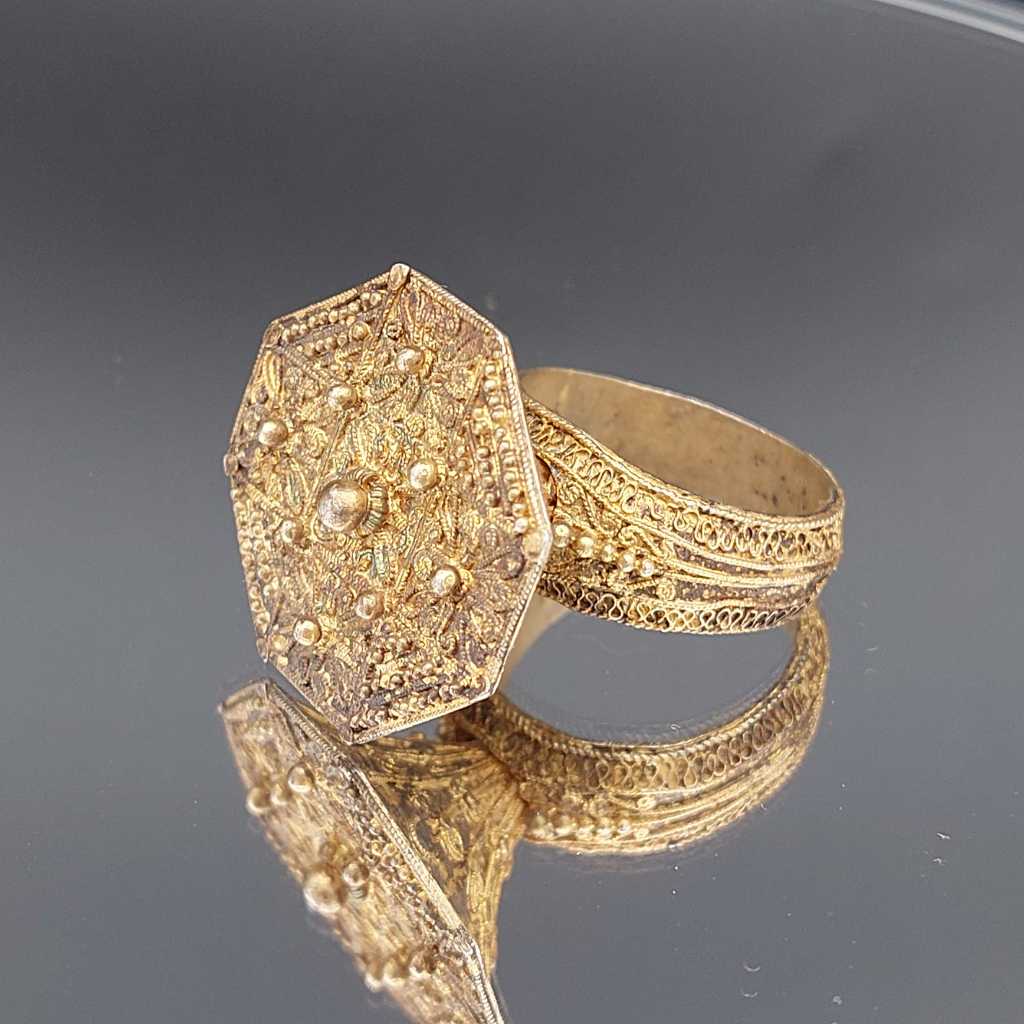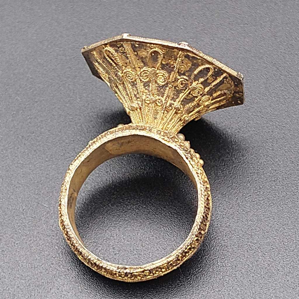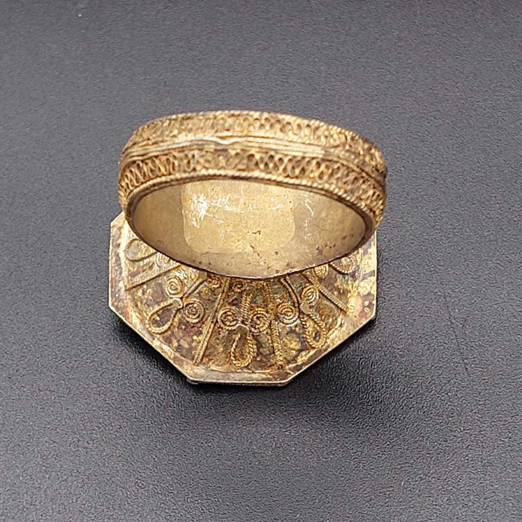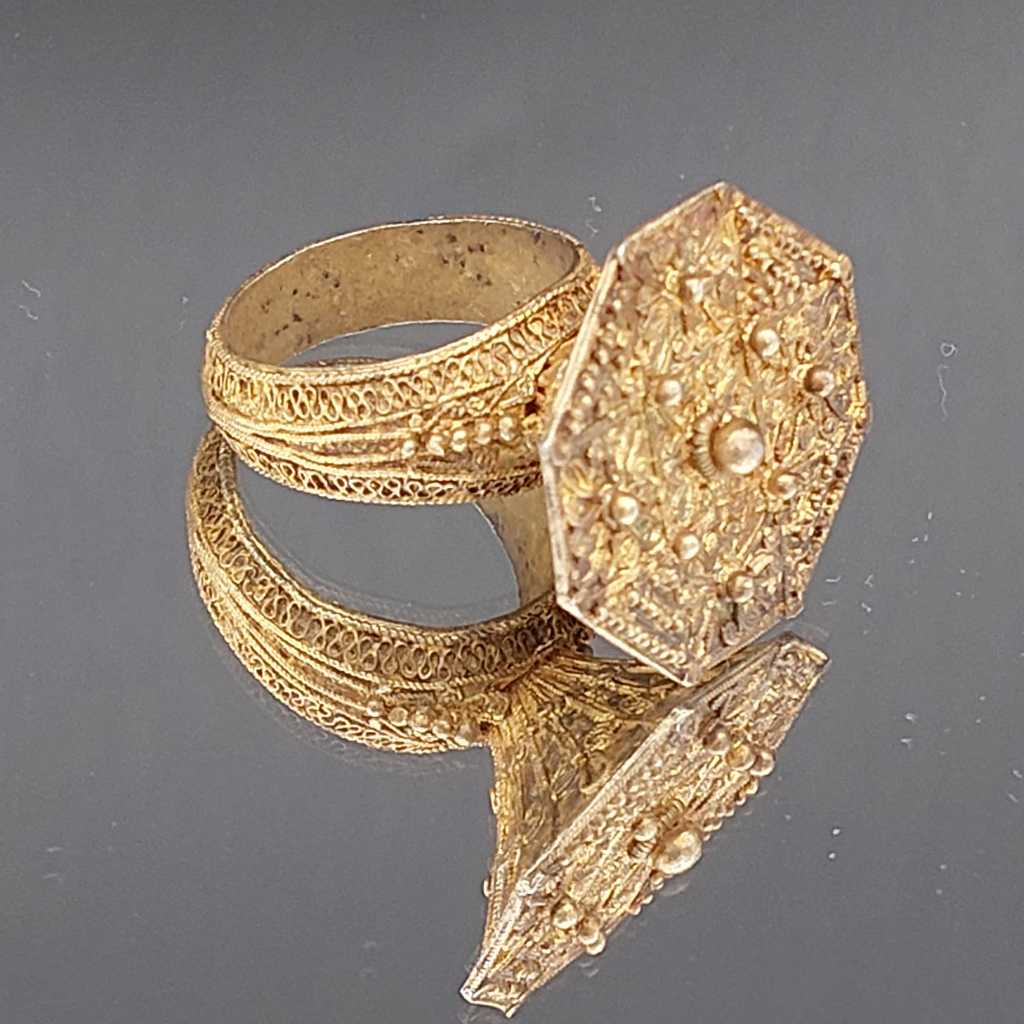 Cincin emas Karo-Batak (cincin topak gajah)Cincin ini terbuat dari emas dan perak dengan permukaan segi delapan ditempatkan tinggi yang disolder ke lingkaran, dihiasi dengan motif geometris dan bunga yang sangat detail dari kawat bengkok (kerawang) dan granulasi.Cincin penting dalam upacara adat dan penyembuhan, mengusir sial dan penyakit dari tendi atau jiwa pemakainya.Cincin memiliki patina yang bagus, dan secara umum dalam kondisi baik.Ukuran cincin +- 22 mm, berat 15,5 gram, ukuran cincin 4,2 x 3 x 3