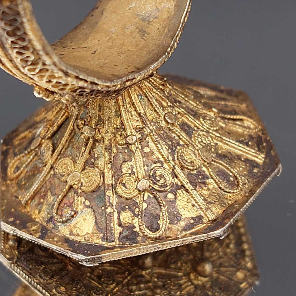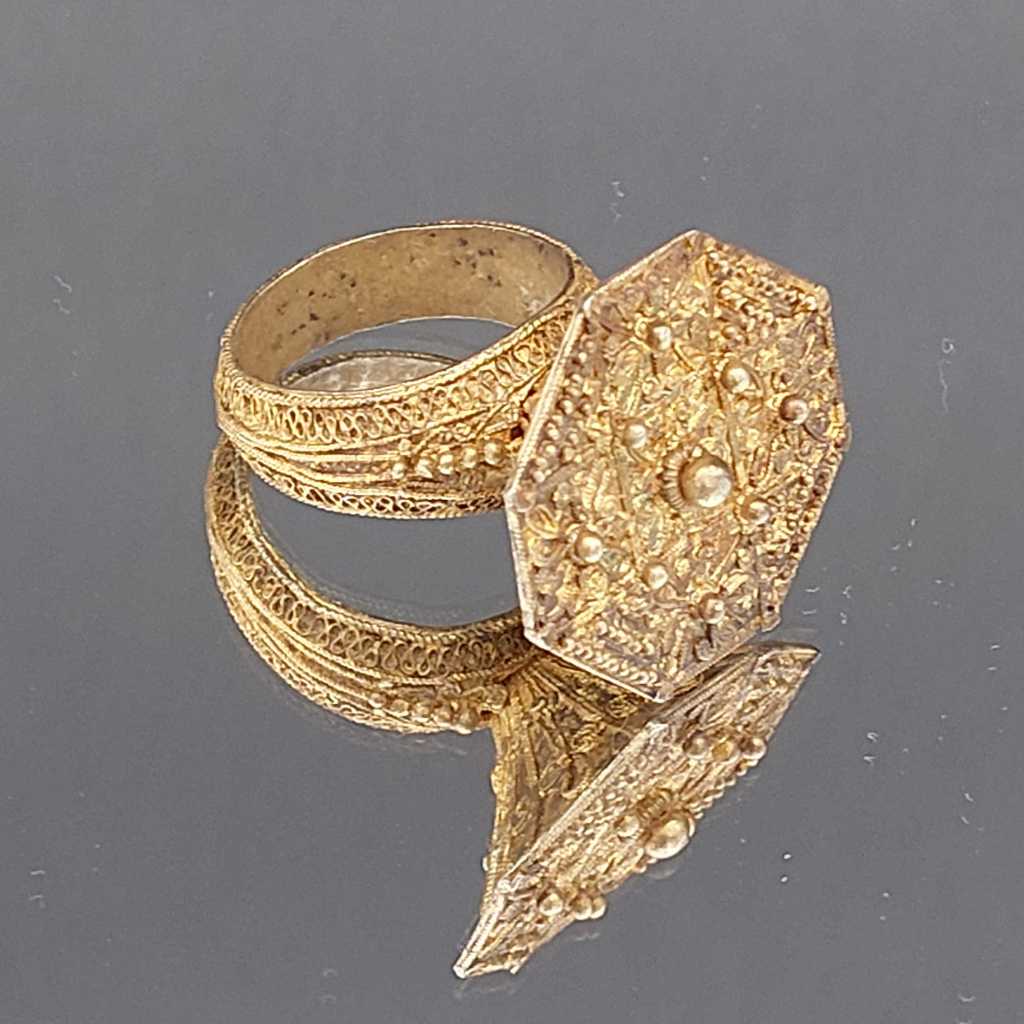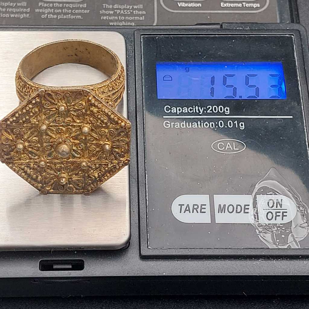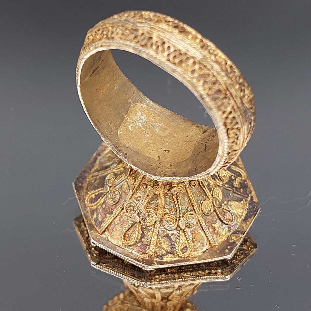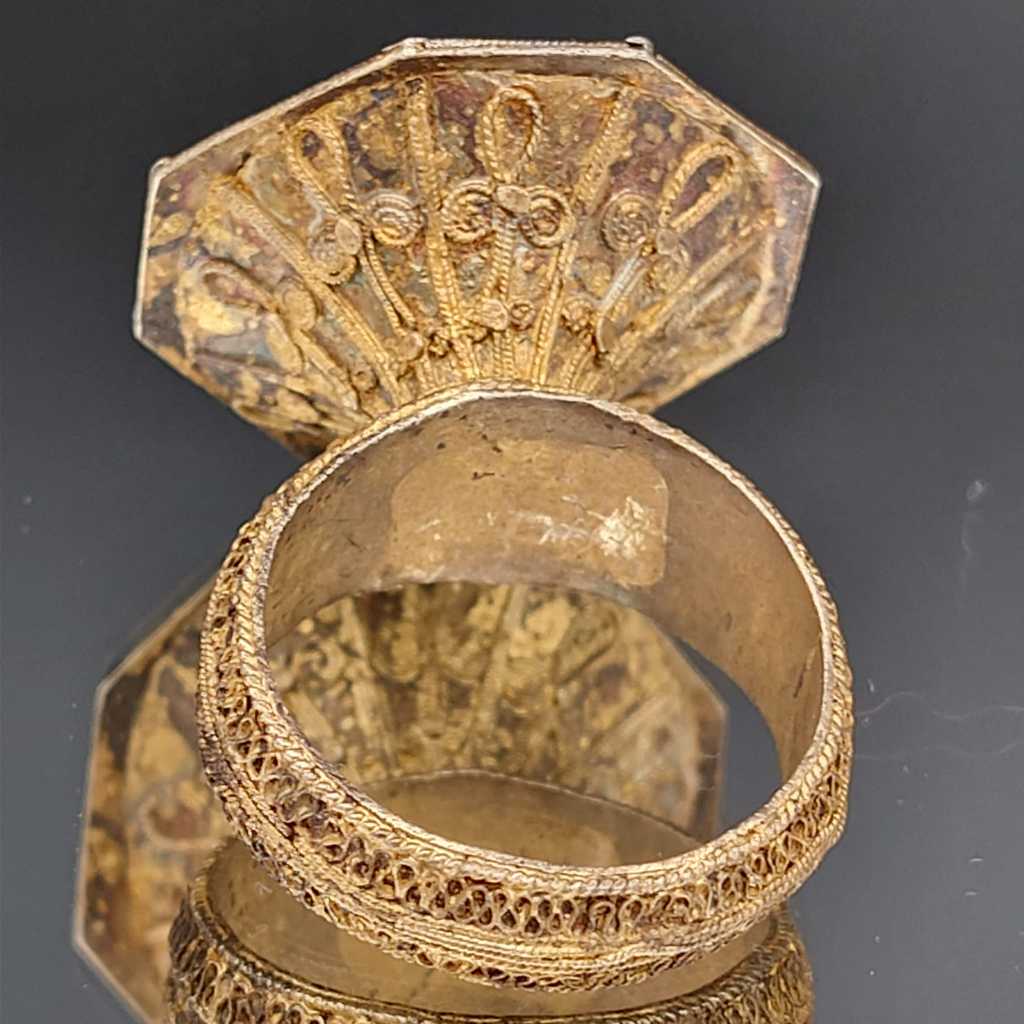 Cincin emas Karo-Batak (cincin topak gajah)Cincin ini terbuat dari emas dan perak dengan permukaan segi delapan ditempatkan tinggi yang disolder ke lingkaran, dihiasi dengan motif geometris dan bunga yang sangat detail dari kawat bengkok (kerawang) dan granulasi.Cincin penting dalam upacara adat dan penyembuhan, mengusir sial dan penyakit dari tendi atau jiwa pemakainya.Cincin memiliki patina yang bagus, dan secara umum dalam kondisi baik.Ukuran cincin +- 22 mm, berat 15,5 gram, ukuran cincin 4,2 x 3 x 3