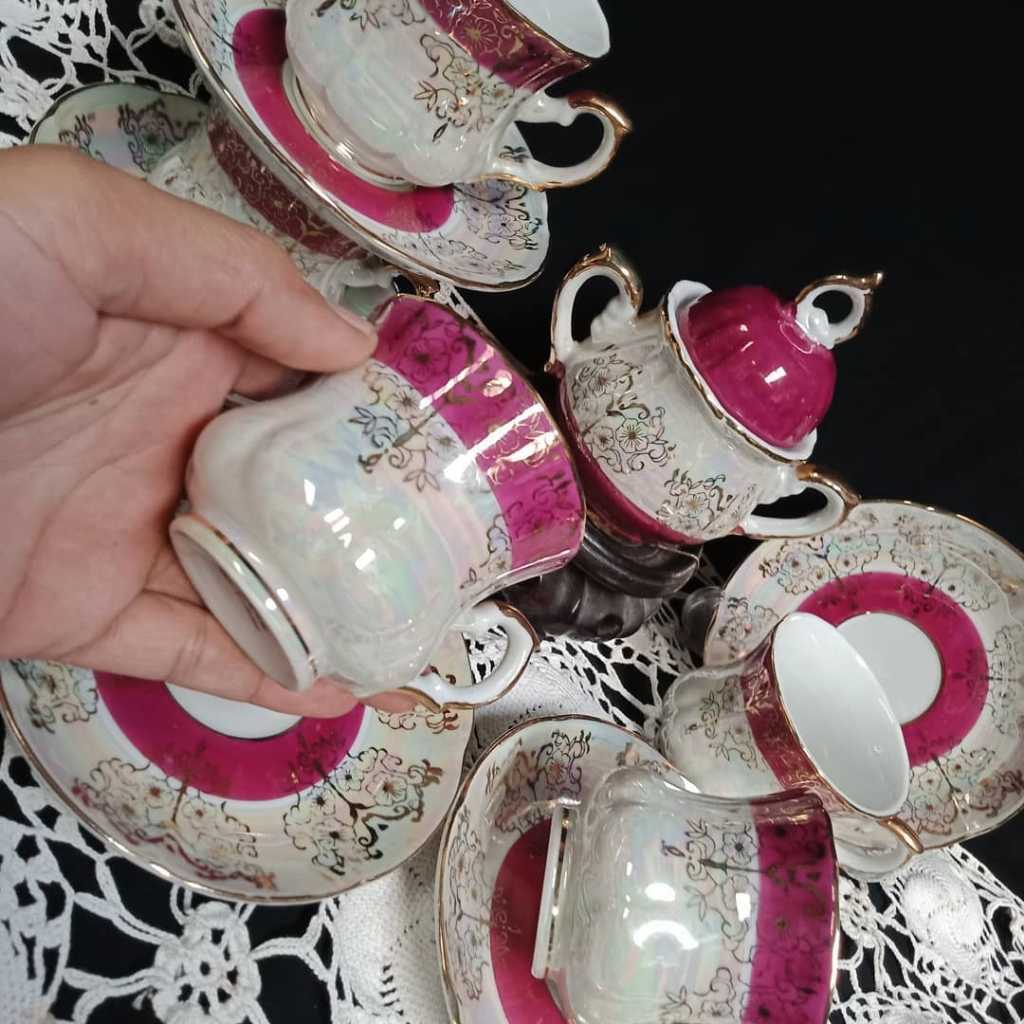Tea set kurang lengkap.Bentuk cangkir unik.kondisi utuh mulus.Barang Terawat lis emas masih tebal