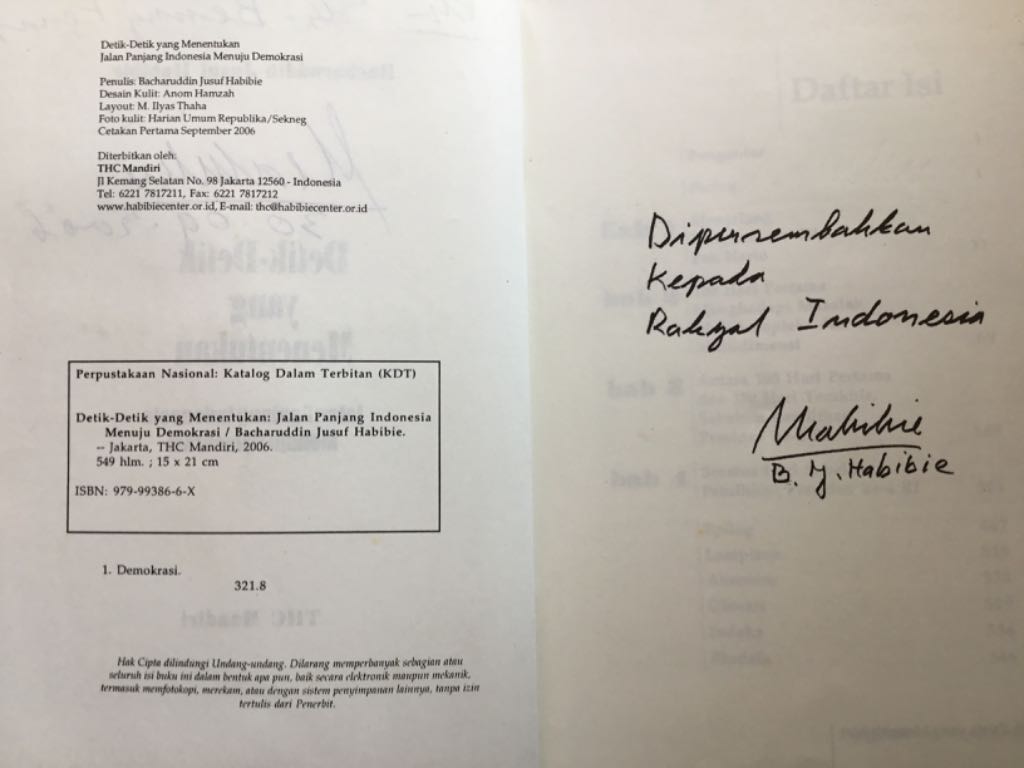 Buku ini ditandatangani langsung oleh pak Habibie untuk pemilik awal buku ini, pak Benny Fenas.