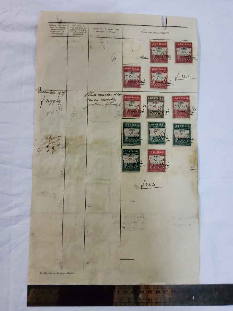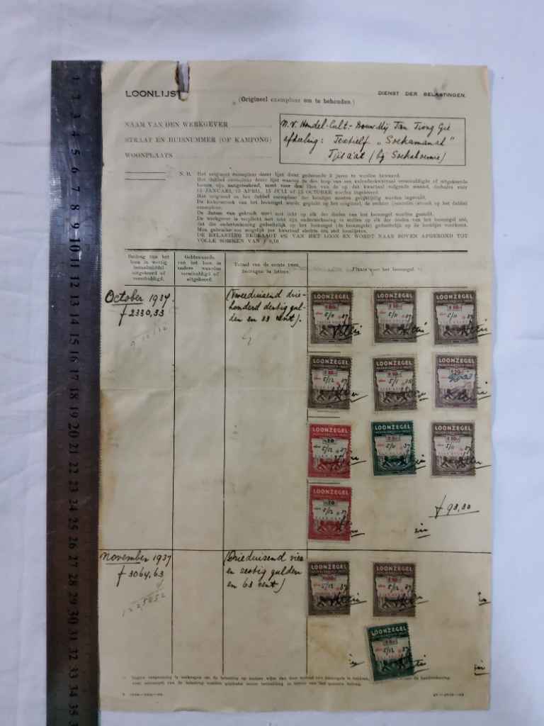 Dokumen Padjak LOONLIJST, Textielt "Soekamanah" Tjisaat Soekaboemi, tahun 1937 dengan 25 buah segel oepah "LOONZEGEL NEDERLANDSCH-INDIE"