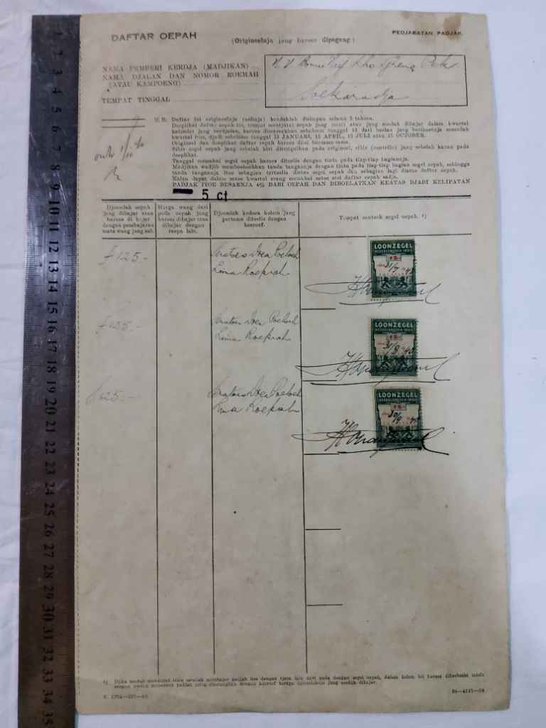 Dokumen Padjak Daftar Oepah Soekaradja, tahun 1940 dengan 3 buah segel oepah "LOONZEGEL NEDERLANDSCH-INDIE" f 5,- (vijf gulden)"