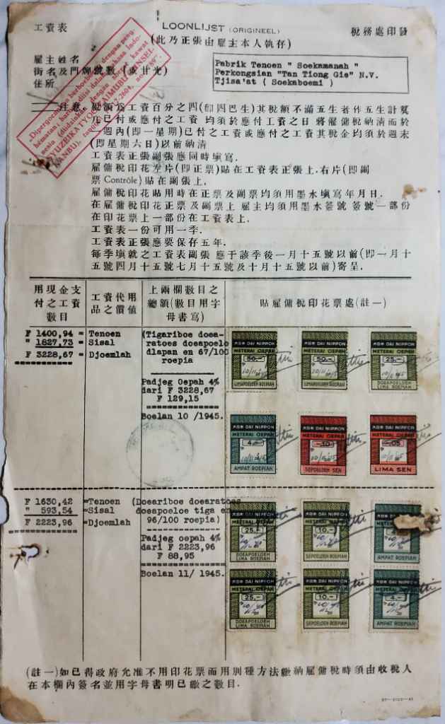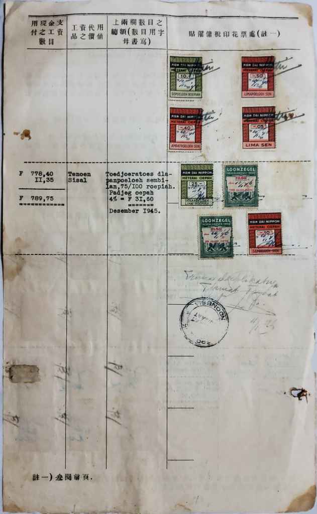 Dokumen Padjak Daftar Oepah, zaman jajahan jepang 1945 dengan 18 buah materai oepah 'DAI NIPPON" dan 2 buah materai "LOONZEGEL NEDERLANDSCH-INDIE"