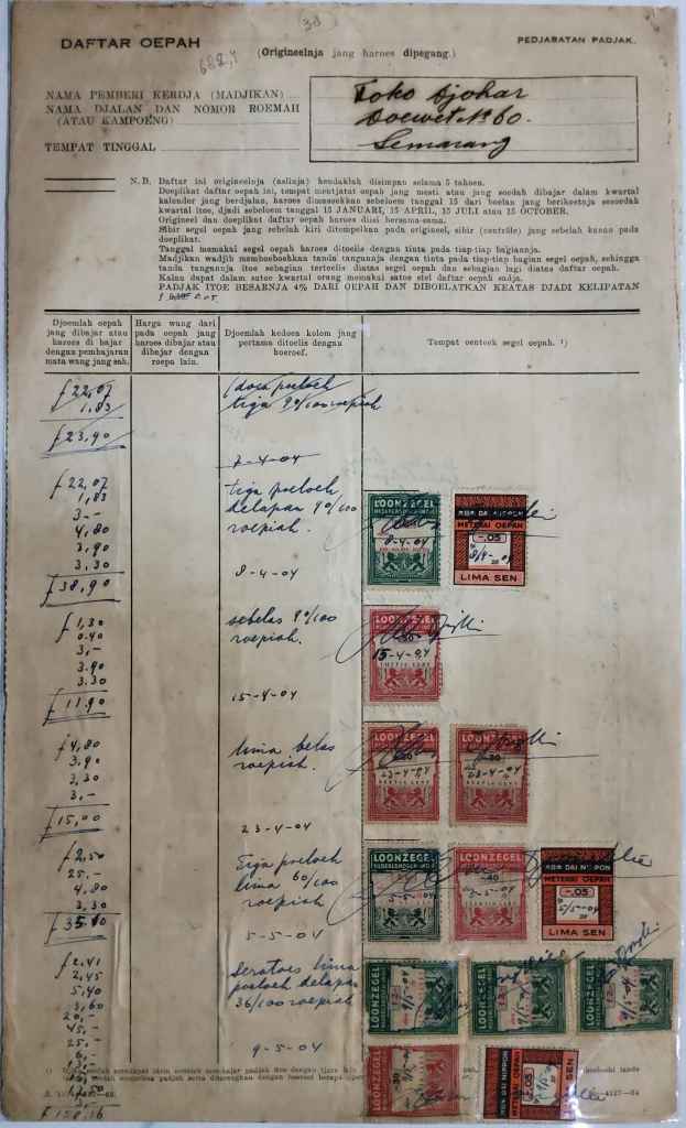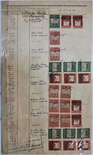 Dokumen Padjak Daftar Oepah, zaman jajahan jepang 14-10-04 dengan 13 buah materai oepah 'DAI NIPPON" 3 buah materai "LOONZEGEL NEDERLANDSCH-INDIE"